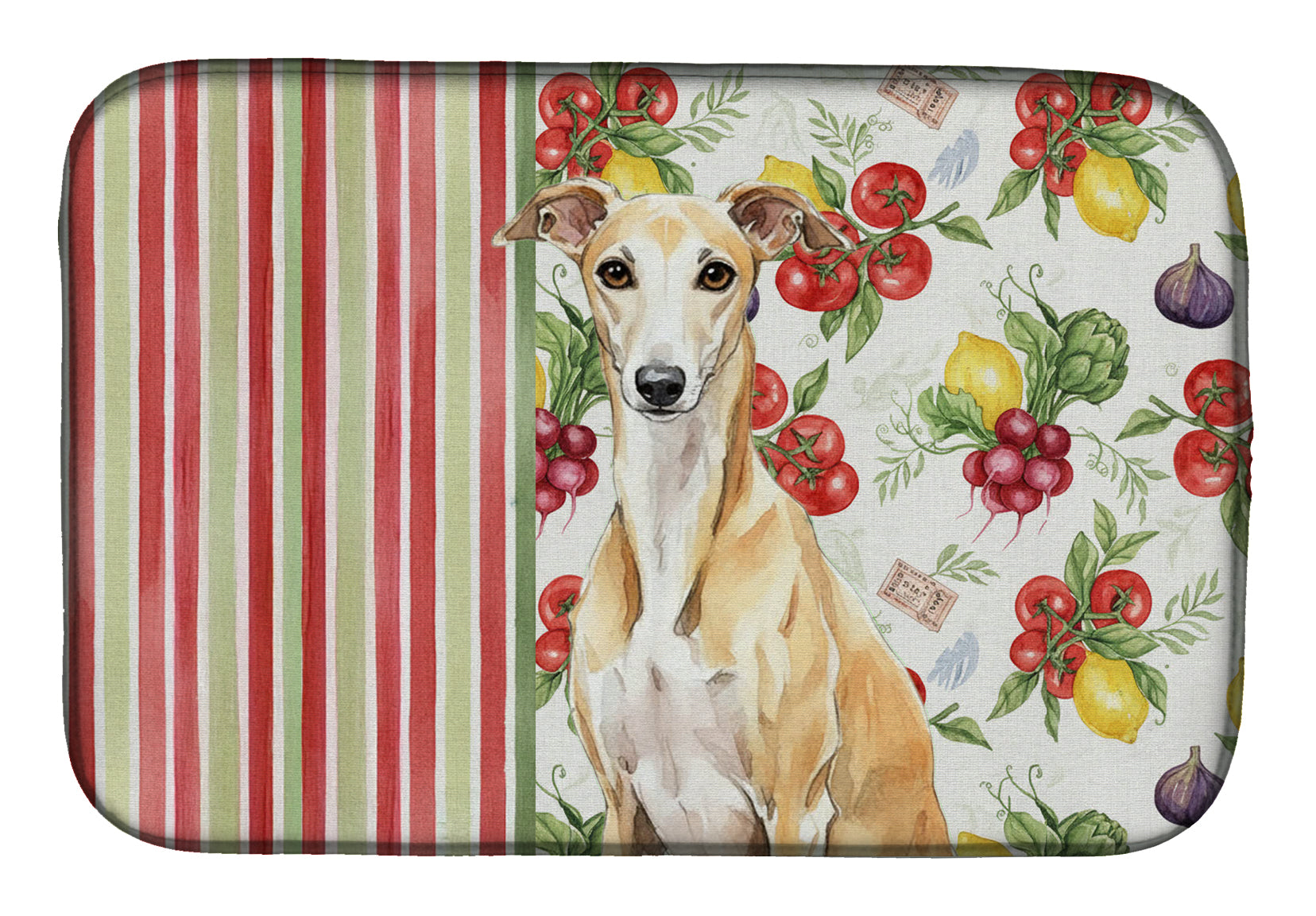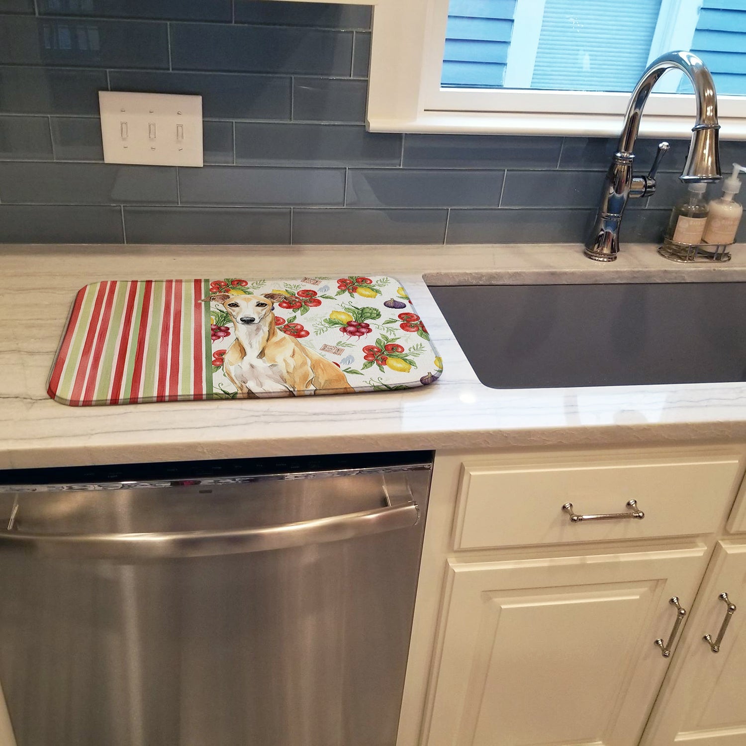 Shown here is the Fawn Whippet Vegetables Dish Drying Mat from Caroline's Treasures featuring artwork of a Whippet in a Everyday design. The detailed illustration and vibrant colors make it a standout accent that celebrates both seasonal style and love for the subject. This image features a vibrant watercolor vegetable pattern with tomatoes, lemons, artichokes, figs, radishes, and leafy greens arranged in a repeating design, paired with classic red and green stripes. The bright, garden-fresh palette creates a cheerful, farmhouse-inspired look that feels lively, welcoming, and perfect for kitchen décor. Everyday décor celebrates personal style and the small moments that make a house feel like home. Thoughtful designs add warmth and personality that can be enjoyed year-round. Say goodbye to messy countertops and soggy dish towels with our innovative dish drying mat. Our high-quality dish drying pad is designed to keep your countertops dry while offering a stylish and efficient solution. Whether you're air drying dishes, glasses, stemware, silverware, pots, pans, bottles, or even fruits and vegetables, our dish mat is the perfect choice. The 14 inches x 21 inches size fits most counters and dish drying racks, and the non-slip design ensures stability. Made with water-absorbent polyester and a polyurethane foam insert, our dish drying mat is not only functional but also durable. It's machine washable and printed in the USA for long-lasting use. The beautiful artwork adds flair to your kitchen decor, making it a perfect housewarming gift or present for any occasion. Upgrade your kitchen experience with our absorbent and versatile dish drying mat. Perfect for: Kitchen counters and sinks, everyday dish drying and countertop protection, Dogs-themed homes, or year-round use for Whippet lovers. Whippets are graceful sighthounds known for their speed and gentle temperament. This breed is admired for its calm nature, loyalty, and elegant movement. Makes a heartfelt gift for: Whippet owners, Dogs lovers, Everyday gifts, pet parents, friends who adore their Whippet, or anyone celebrating Dogs.