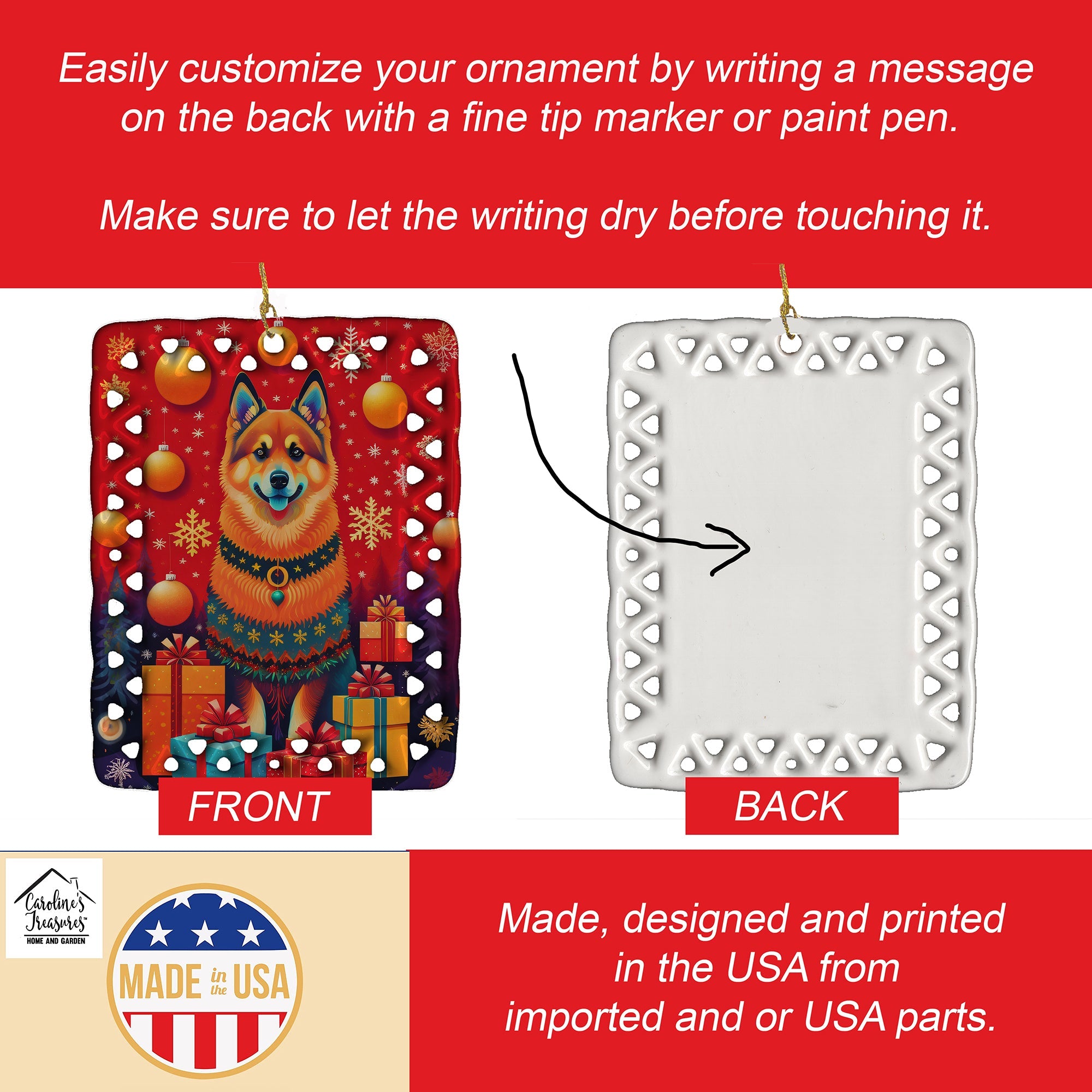 Porcelain Ornament featuring breed specific Finnish Spitz artwork. Celebrate Christmas with this Christmas Ornament. Add a unique, personal touch to your holiday decor with our Rectangular Lattice Porcelain Ornament. Perfect for creating cherished memories, this high-quality ornament shines under festive lights, reflecting warmth and joy throughout your Christmas tree. Crafted with a glossy finish, it showcases vibrant, full-color artwork contributed by our talented artists, ensuring your tree is adorned with a burst of color and holiday spirit. What sets this Porcelain Ornament apart is its customizable white back. Use a paint pen or permanent marker to write a heartfelt message, commemorate a special year, or mark an unforgettable date, turning this ornament into a keepsake that will be treasured for years to come. For best results, allow any personalization to dry thoroughly before handling. Each ornament comes complete with a delicate gold cord, making it easy to hang and display. Proudly made in the USA, this ornament measures 3.375 x 2.625 inches and is a thoughtful gift for pet sitters, teachers, family members, or anyone who would appreciate a little extra holiday magic. Bring style, charm, and a touch of personal meaning to your Christmas tree with this beautifully designed ornament..