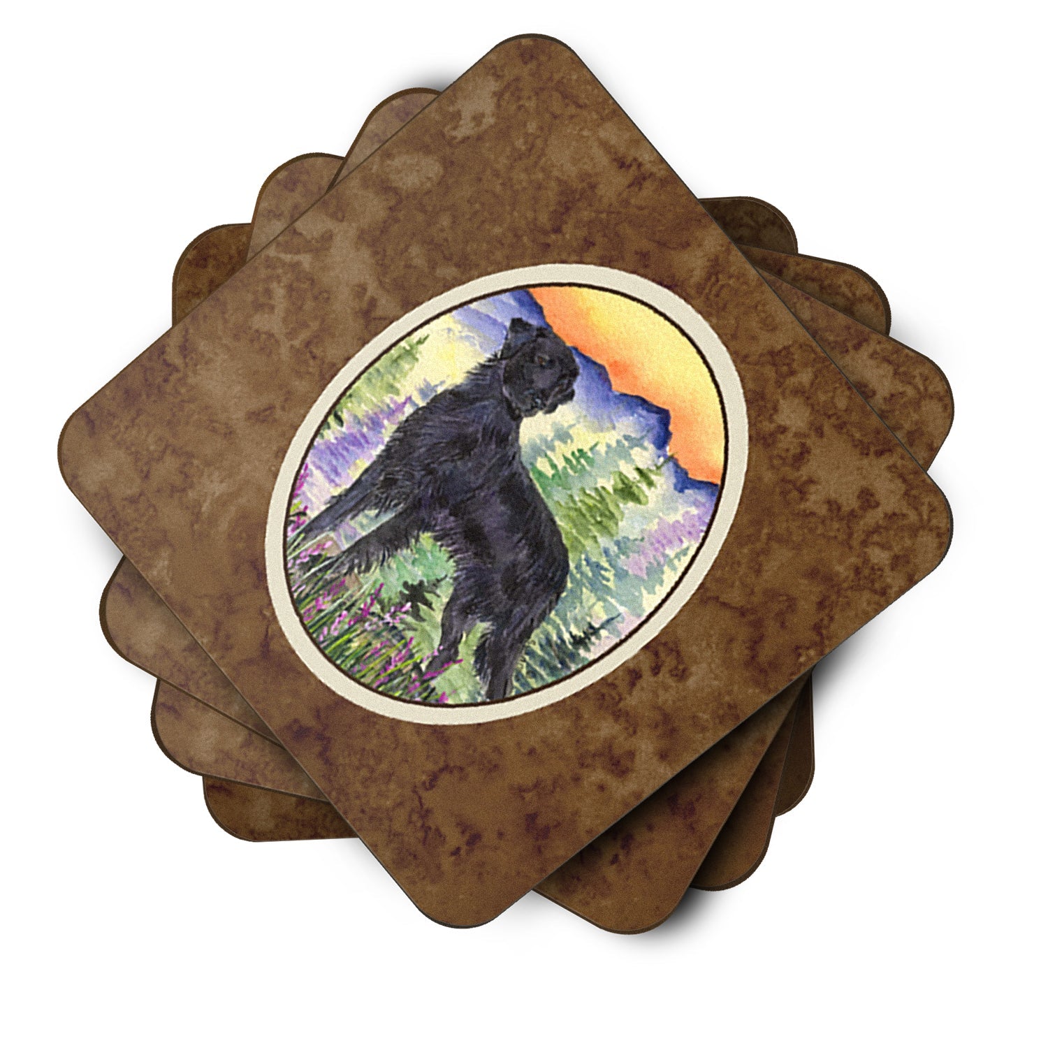 Decorate your space with our Flat-Coated Retriever artwork on a Coaster set. Presenting our Set of 4 Foam Coasters, a stylish and practical addition to your table setting. Each square coaster, measuring 3 1/2 inches by 3 1/2 inches, is perfectly sized to accommodate various drinkware, from coffee mugs to tumblers. These coasters stand out with their full-color artwork, permanently dyed onto the material for a vibrant and fade-resistant finish. They're not just functional, they're a fashionable statement, adding a touch of flair to any gathering or event. Our foam coasters serve a dual purpose - they protect your table from water stains and are perfect for both hot and cold drinks. The material used is similar to that of our high-quality mouse pads, ensuring durability and heat resistance. These coasters are easy to maintain - simply wash them in the top of your dishwasher and lay flat to dry. The design won't come off, ensuring they retain their vivid colors for years. Pair them with one of our insulated coolers or huggers for a cohesive, thoughtful gift set. Enhance your beverage experience with our Set of 4 Foam Coasters.