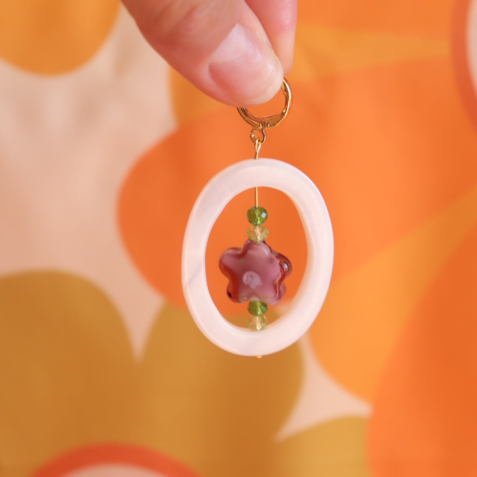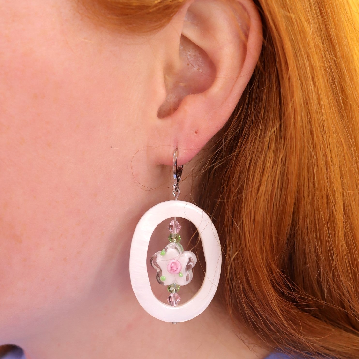 Get playful with your style in our Framed Glass Flower Earrings! These delicate earrings feature a hand-blown glass flower nestled in an oval shell, creating a unique and eye-catching accessory.