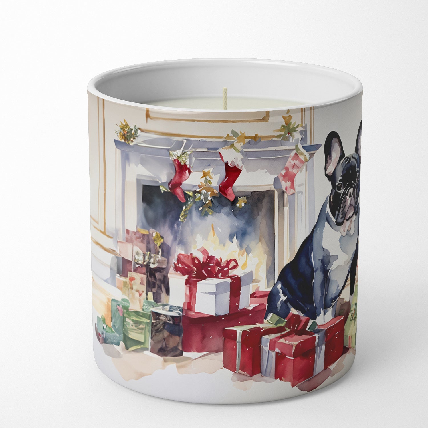 Decorate your space with our Christmas French Bulldog artwork on a 10 oz Soy Candle. Upgrade your ambiance with our Decorative Soy Wax Candle. No more settling for ordinary candles. With a beautifully designed 10 oz container adorned with exclusive artwork from our artists, this candle not only illuminates your space but also adds a touch of elegance to your decor. Crafted with meticulous care, each candle is hand-poured and made from 100% soy wax, ensuring a clean, consistent burn. Free from chemical-based dyes, the all-white wax complements any setting. Our soy wax is paired with high-quality fragrance oils, releasing a robust scent that transforms your surroundings. The candle provides a great deal of burn time, though this may vary based on air flow, burn duration, and wick maintenance. For safe use, always trim the wick to 1/4 inch before lighting and ensure your candle is on a level surface. We recommend not burning for more than four hours at a time and discontinuing use when only 1/4 inch of wax remains. Our Decorative Soy Wax Candle is more than just a candle. It is a piece of art that enhances your space while ensuring a soothing, fragrant ambiance. Remember, always burn within sight, and keep away from flammable objects, pets, and children. Enjoy the beauty and tranquility it brings to your everyday life.