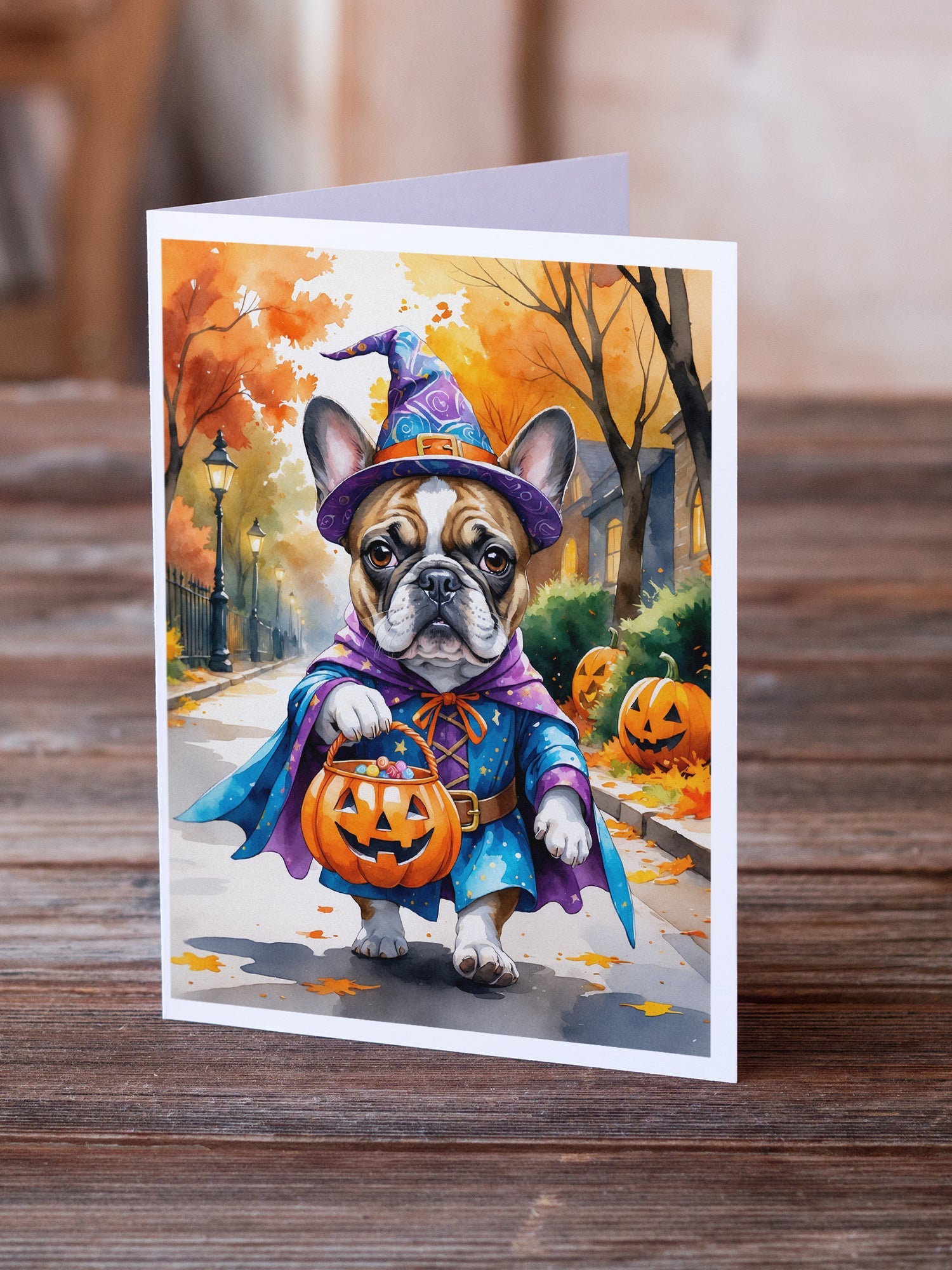 Greeting Cards Pack of 8 featuring breed specific French Bulldog artwork. Celebrate Halloween with this Halloween . Celebrate special moments with Caroline's Treasures Printed Greeting Card Pack. This pack includes eight beautifully folded 5x7 cards, accompanied by eight matching white envelopes. With blank interiors, these cards provide ample space for your personalized messages and heartfelt holiday greetings. Each card features captivating full-color artwork, meticulously printed in our facility on high-quality 80 lb cover stock or 216 GSM. The super smooth finish of the white cards enhances the visual impact of the artwork, creating a truly stunning presentation. Designed by our talented in-house artists or licensed artists, the artwork on these cards showcases their creativity and attention to detail. From vibrant illustrations to captivating designs, each card tells its own unique story. Whether it's for birthdays, anniversaries, holidays, or any special occasion, Caroline's Treasures Greeting Card Pack is the perfect way to convey your heartfelt sentiments. Share joy, love, and warm wishes with these exquisite cards and make every moment unforgettable.