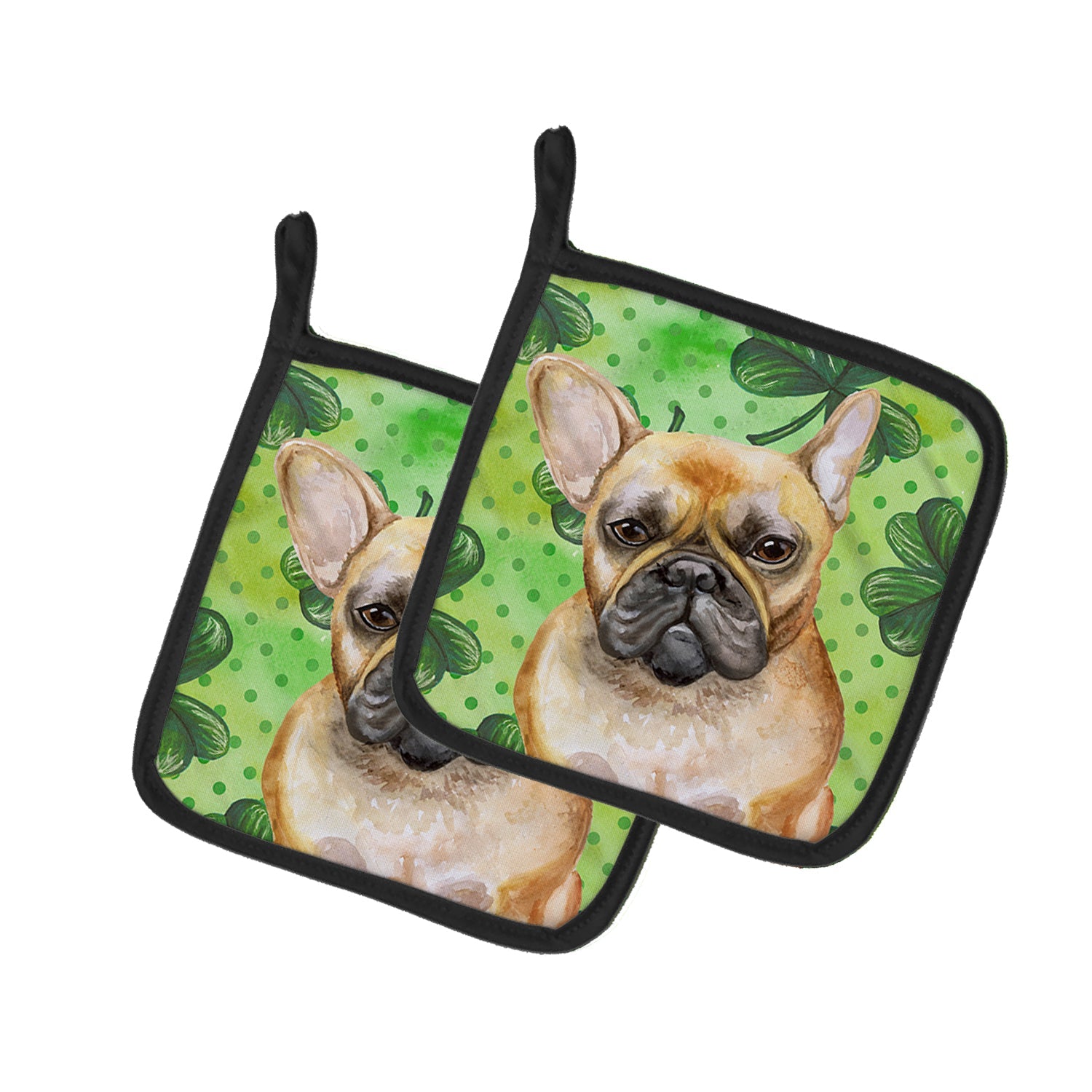 Decorate your space with our St Patrick's Day French Bulldog artwork on a Pair of Pot Holders. A Pair of Pot Holders to match your kitchen decor. Made in the USA these are thick and functional. Full color artwork decorates the front polyester fabric of the hot pad and accented by a black trim. Use these at as a trivet for your Thanksgiving or Christmas tablescape. Filled with insulated fabric and quilted for durability. These colorful pot holders will make a great gift for your favorite home cook or executive chef. Each pot holder measures approximately 7 1/2 inches by 7 1/2 inches. A hanging tab is included.