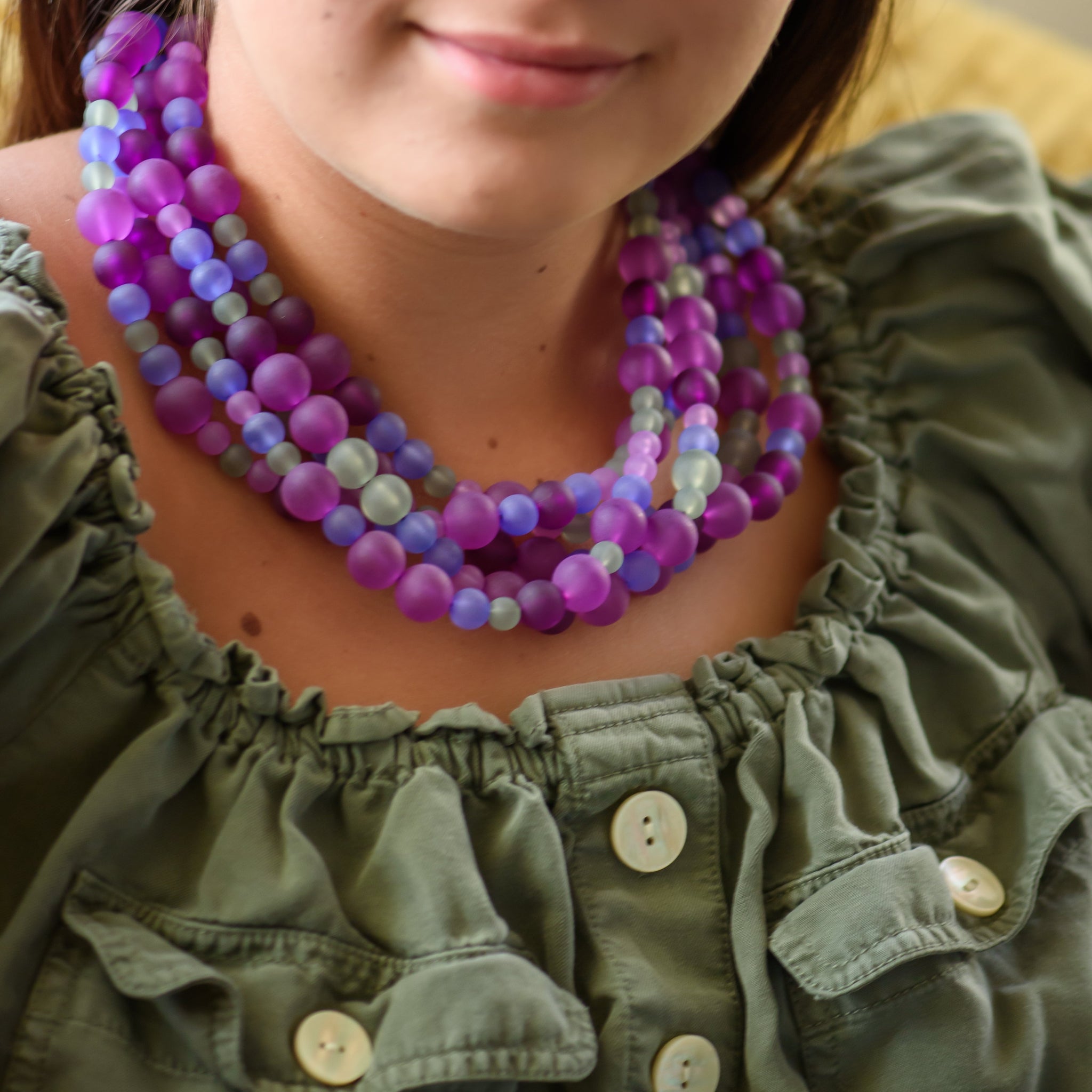 Some saturated tones in frosted finish goodness. Like matte beach glass, this necklace includes tones of amethyst and emeralds, hints of purple-y blues & greens. Made with hand-dyed vintage so each necklace will sport it's own unique mix. The beads in this necklace are varied in shape & size for a great, textured look. The necklace measures 15.5-16" at its shortest + a 6" extender. Lightweight and fun to wear: a classic style that will outlast trends.