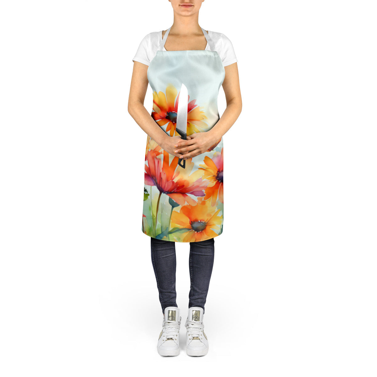 Decorate your space with our Gerbera Daisies artwork on a Apron. Elevate your cooking, baking, and grilling experiences with our versatile Kitchen or BBQ Apron. This Bib Style apron isn't just limited to culinary activities - it also serves as an excellent baking apron, artist apron, server apron, gardening apron, or even a dog grooming apron. The apron showcases vibrant full-color artwork contributed by one of our talented artists, bringing a dash of style to your daily tasks. With dimensions of approximately 27"W x 30"H, it provides ample coverage to protect your clothing from spills and splashes. Our apron is meticulously crafted from 100% Ultra Spun Polyester, known for its durability and lightweight nature. The apron comes with white tie straps, ensuring a comfortable and adjustable fit for all. It's a perfect choice for kitchen apron enthusiasts, whether you are a woman or a man. Designed for easy maintenance, this apron is fully machine washable. The quick-drying polyester material actively reduces staining, keeping your apron looking fresh and new for longer. Our beautifully designed apron isn't just a functional kitchen accessory - it's a fashion statement in the culinary world!