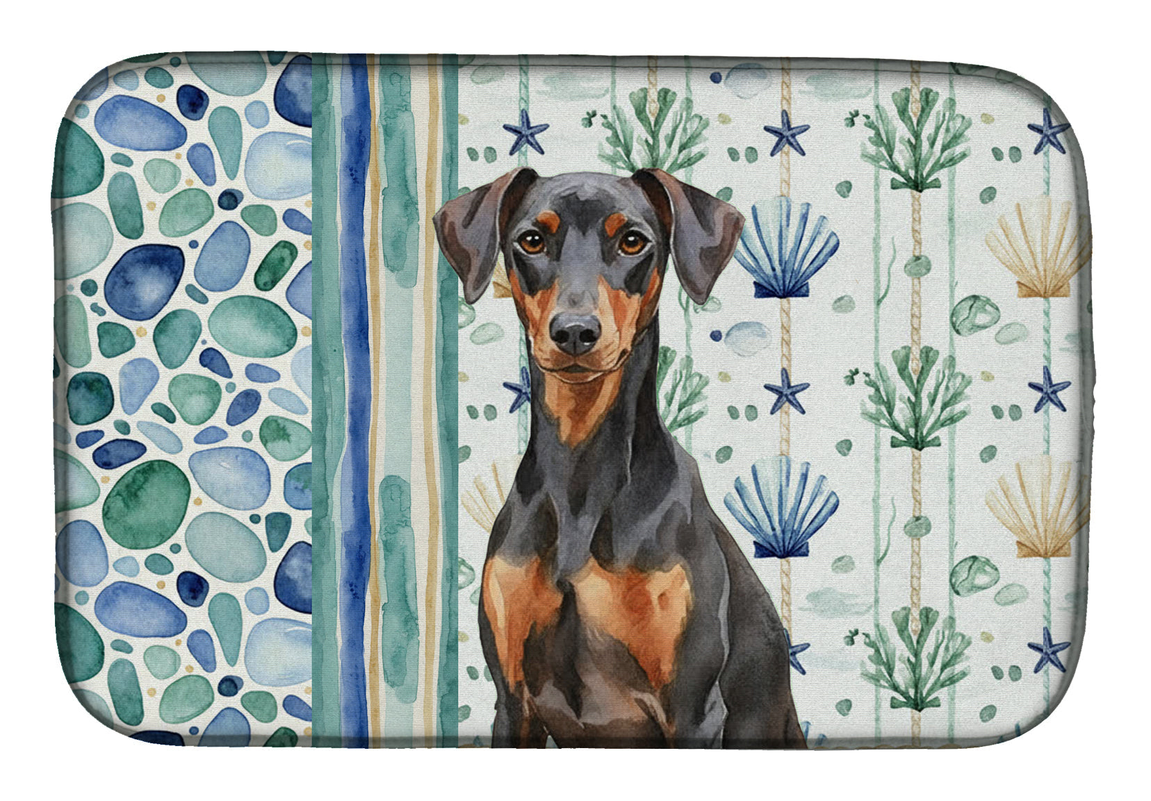 Shown here is the German Pinscher Coastal Sea Glass Dish Drying Mat from Caroline's Treasures featuring artwork of a German Pinscher in a Everyday design. The detailed illustration and vibrant colors make it a standout accent that celebrates both seasonal style and love for the subject. This image features a calming coastal watercolor pattern with soft seashells, seaweed, starfish, and pebble-inspired accents arranged in a repeating design. The soothing palette of blues, greens, and sandy neutrals creates a relaxed, beach-inspired look that adds a fresh and tranquil feel to any space. Everyday décor celebrates personal style and the small moments that make a house feel like home. Thoughtful designs add warmth and personality that can be enjoyed year-round. Say goodbye to messy countertops and soggy dish towels with our innovative dish drying mat. Our high-quality dish drying pad is designed to keep your countertops dry while offering a stylish and efficient solution. Whether you're air drying dishes, glasses, stemware, silverware, pots, pans, bottles, or even fruits and vegetables, our dish mat is the perfect choice. The 14 inches x 21 inches size fits most counters and dish drying racks, and the non-slip design ensures stability. Made with water-absorbent polyester and a polyurethane foam insert, our dish drying mat is not only functional but also durable. It's machine washable and printed in the USA for long-lasting use. The beautiful artwork adds flair to your kitchen decor, making it a perfect housewarming gift or present for any occasion. Upgrade your kitchen experience with our absorbent and versatile dish drying mat. Perfect for: Kitchen counters and sinks, everyday dish drying and countertop protection, Dogs-themed homes, or year-round use for German Pinscher lovers. German Pinschers are confident working dogs known for their intelligence and alert nature. This breed is admired for its loyalty, agility, and strong protective instincts. Makes a heartfelt gift for: German Pinscher owners, Dogs lovers, Everyday gifts, pet parents, friends who adore their German Pinscher, or anyone celebrating Dogs.