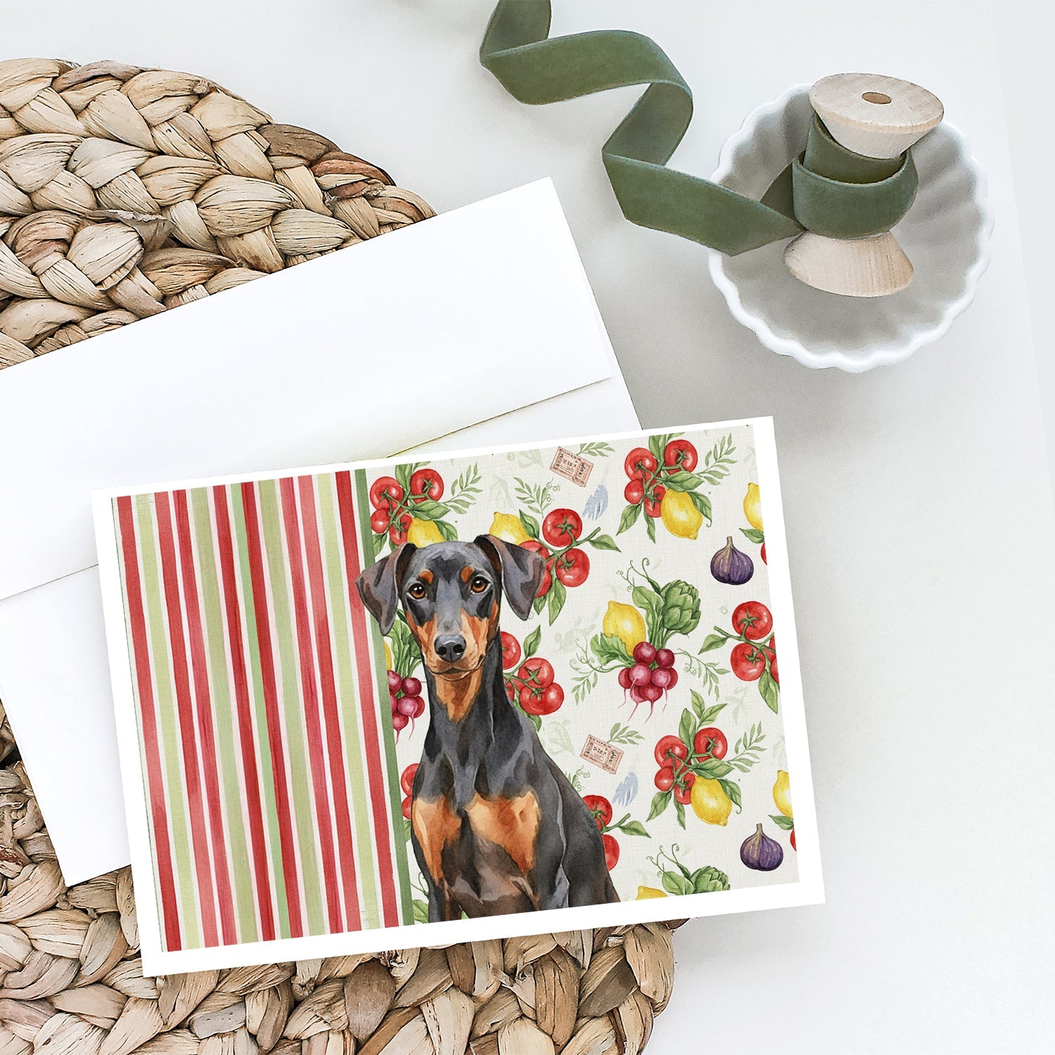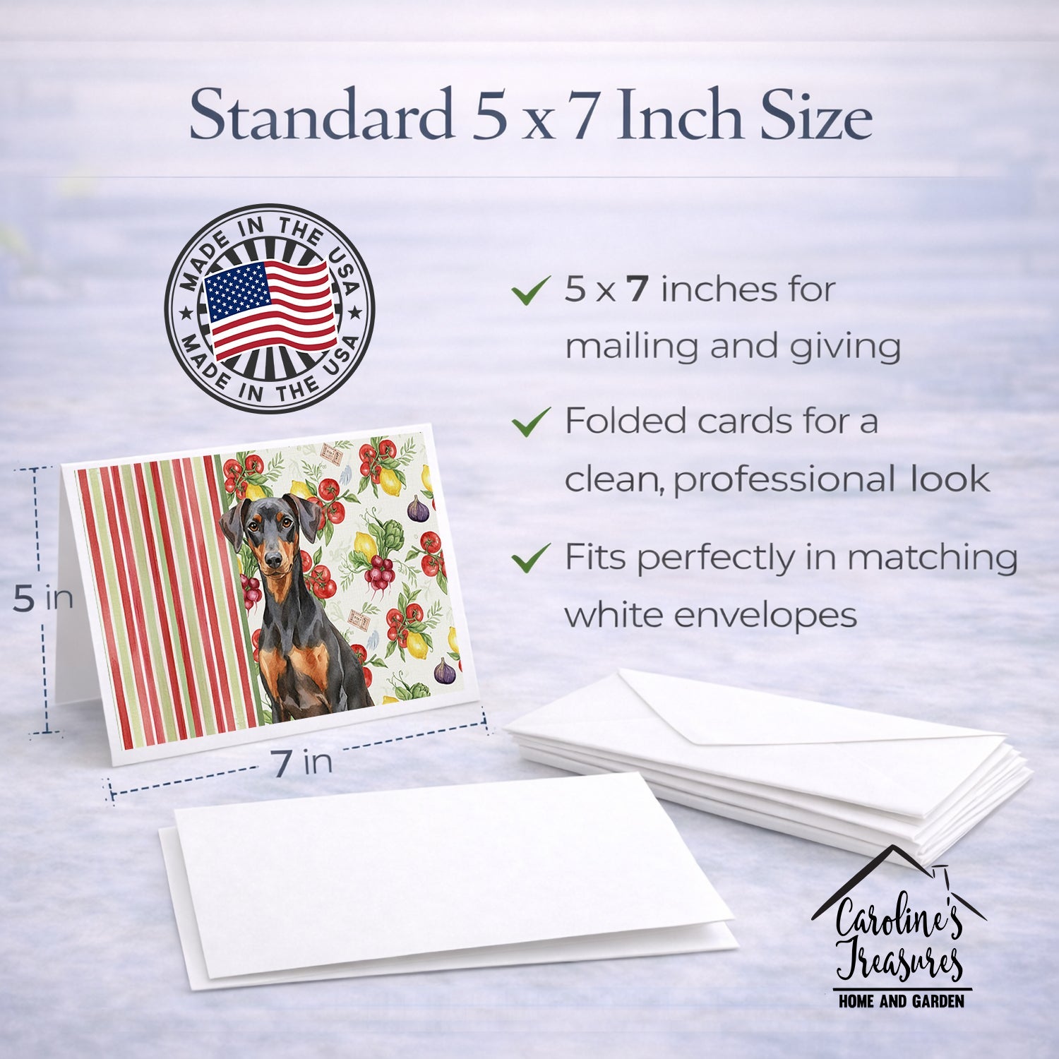 Shown here is the German Pinscher Vegetables Greeting Cards Pack of 8 from Caroline's Treasures featuring artwork of a German Pinscher in a Everyday design. The detailed illustration and vibrant colors make it a standout accent that celebrates both seasonal style and love for the subject. This image features a vibrant watercolor vegetable pattern with tomatoes, lemons, artichokes, figs, radishes, and leafy greens arranged in a repeating design, paired with classic red and green stripes. The bright, garden-fresh palette creates a cheerful, farmhouse-inspired look that feels lively, welcoming, and perfect for kitchen décor. Everyday décor celebrates personal style and the small moments that make a house feel like home. Thoughtful designs add warmth and personality that can be enjoyed year-round. Celebrate special moments with Caroline's Treasures Printed Greeting Card Pack. This pack includes eight beautifully folded 5x7 cards, accompanied by eight matching white envelopes. With blank interiors, these cards provide ample space for your personalized messages and heartfelt holiday greetings. Each card features captivating full-color artwork, meticulously printed in our facility on high-quality 80 lb cover stock or 216 GSM. The super smooth finish of the white cards enhances the visual impact of the artwork, creating a truly stunning presentation. Designed by our talented in-house artists or licensed artists, the artwork on these cards showcases their creativity and attention to detail. From vibrant illustrations to captivating designs, each card tells its own unique story. Whether it's for birthdays, anniversaries, holidays, or any special occasion, Caroline's Treasures Greeting Card Pack is the perfect way to convey your heartfelt sentiments. Share joy, love, and warm wishes with these exquisite cards and make every moment unforgettable. Perfect for: Writing personal messages, everyday correspondence, and thoughtful notes, Dogs-themed stationery collections, or year-round use for German Pinscher lovers. German Pinschers are confident working dogs known for their intelligence and alert nature. This breed is admired for its loyalty, agility, and strong protective instincts. Makes a heartfelt gift for: German Pinscher owners, Dogs lovers, Everyday gifts, pet parents, friends who adore their German Pinscher, or anyone celebrating Dogs.