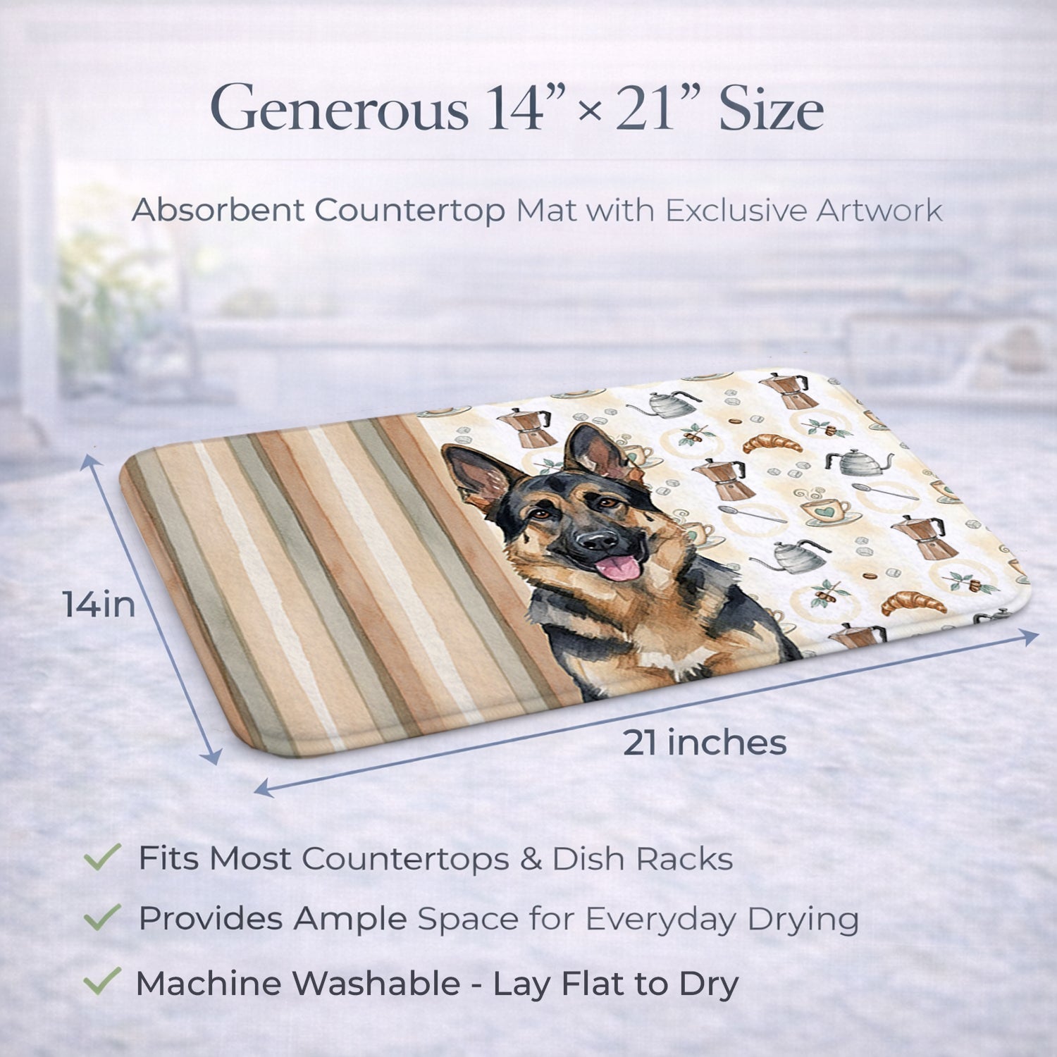 Shown here is the German Shepherd Coffee Bar Dish Drying Mat from Caroline's Treasures featuring artwork of a German Shepherd in a Everyday design. The detailed illustration and vibrant colors make it a standout accent that celebrates both seasonal style and love for the subject. This image features a cozy watercolor coffee-themed pattern with illustrated mugs, moka pots, kettles, croissants, coffee beans, and sugar cubes arranged in a repeating design. Soft neutral tones with warm browns, creams, and subtle sage accents create an inviting, café-inspired look that feels comforting and relaxed. Everyday décor celebrates personal style and the small moments that make a house feel like home. Thoughtful designs add warmth and personality that can be enjoyed year-round. Say goodbye to messy countertops and soggy dish towels with our innovative dish drying mat. Our high-quality dish drying pad is designed to keep your countertops dry while offering a stylish and efficient solution. Whether you're air drying dishes, glasses, stemware, silverware, pots, pans, bottles, or even fruits and vegetables, our dish mat is the perfect choice. The 14 inches x 21 inches size fits most counters and dish drying racks, and the non-slip design ensures stability. Made with water-absorbent polyester and a polyurethane foam insert, our dish drying mat is not only functional but also durable. It's machine washable and printed in the USA for long-lasting use. The beautiful artwork adds flair to your kitchen decor, making it a perfect housewarming gift or present for any occasion. Upgrade your kitchen experience with our absorbent and versatile dish drying mat. Perfect for: Kitchen counters and sinks, everyday dish drying and countertop protection, Dogs-themed homes, or year-round use for German Shepherd lovers. German Shepherds are intelligent working dogs known for their loyalty and versatility. This highly respected breed is valued for its trainability, courage, and strong bond with family. Makes a heartfelt gift for: German Shepherd owners, Dogs lovers, Everyday gifts, pet parents, friends who adore their German Shepherd, or anyone celebrating Dogs.