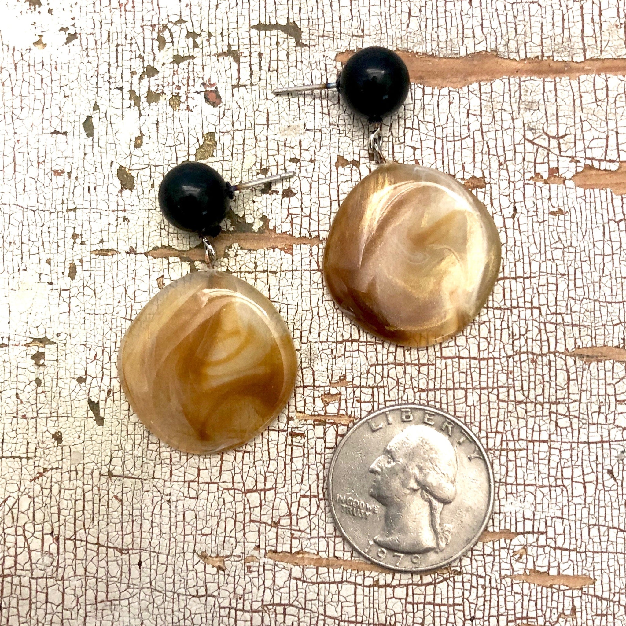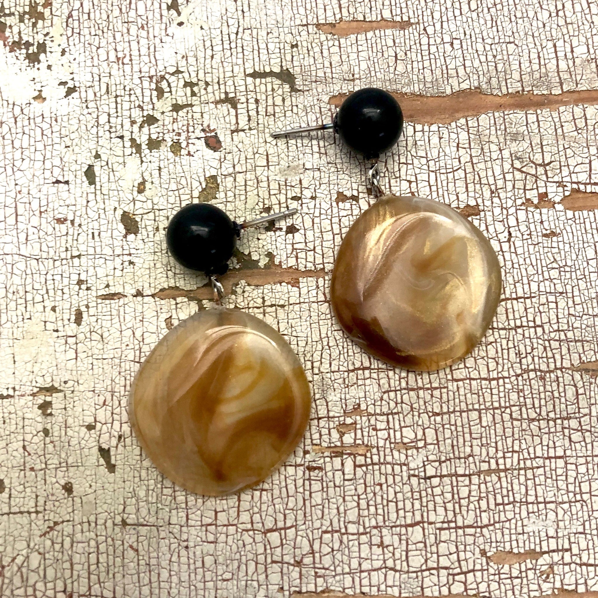 Marbled opalescent white & metallic gold lucite drops in a wavy diamond shape are paired with black studs. These are the Sarah Earrings & they come in 3 colors. Geometric lucite earrings made with vintage parts. These are big & make a statement. Mod meets 80's opulence. Measures just under 1.75" or 43mm from top to bottom & 1" at the widest, but super light weight with just enough swing to make a statement.