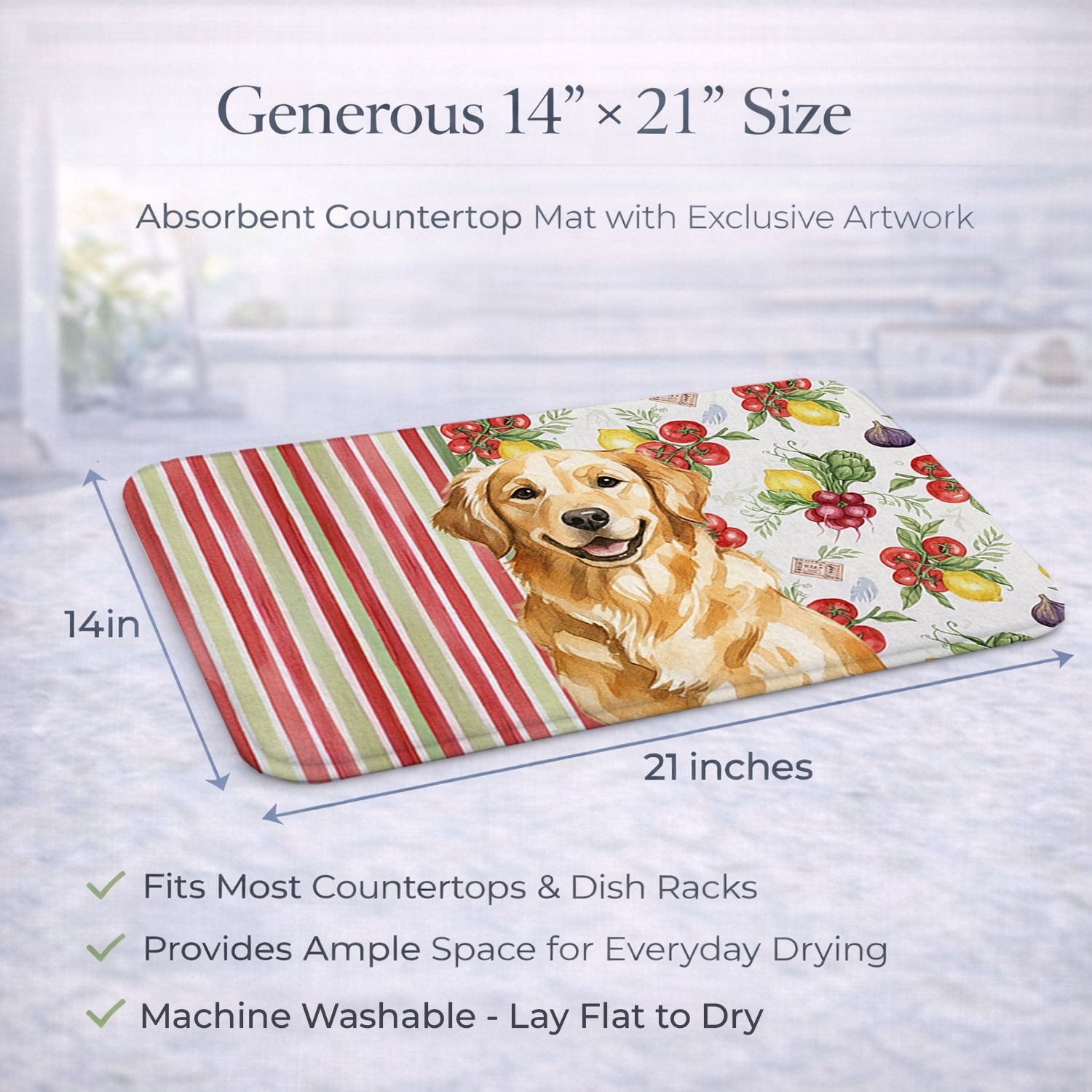 Shown here is the Golden Retriever Vegetables Dish Drying Mat from Caroline's Treasures featuring artwork of a Golden Retriever in a Everyday design. The detailed illustration and vibrant colors make it a standout accent that celebrates both seasonal style and love for the subject. This image features a vibrant watercolor vegetable pattern with tomatoes, lemons, artichokes, figs, radishes, and leafy greens arranged in a repeating design, paired with classic red and green stripes. The bright, garden-fresh palette creates a cheerful, farmhouse-inspired look that feels lively, welcoming, and perfect for kitchen décor. Everyday décor celebrates personal style and the small moments that make a house feel like home. Thoughtful designs add warmth and personality that can be enjoyed year-round. Say goodbye to messy countertops and soggy dish towels with our innovative dish drying mat. Our high-quality dish drying pad is designed to keep your countertops dry while offering a stylish and efficient solution. Whether you're air drying dishes, glasses, stemware, silverware, pots, pans, bottles, or even fruits and vegetables, our dish mat is the perfect choice. The 14 inches x 21 inches size fits most counters and dish drying racks, and the non-slip design ensures stability. Made with water-absorbent polyester and a polyurethane foam insert, our dish drying mat is not only functional but also durable. It's machine washable and printed in the USA for long-lasting use. The beautiful artwork adds flair to your kitchen decor, making it a perfect housewarming gift or present for any occasion. Upgrade your kitchen experience with our absorbent and versatile dish drying mat. Perfect for: Kitchen counters and sinks, everyday dish drying and countertop protection, Dogs-themed homes, or year-round use for Golden Retriever lovers. Golden Retrievers are friendly sporting dogs known for their intelligence and gentle nature. Often called Goldens, this beloved breed is cherished for its loyalty, patience, and strong family bonds. Makes a heartfelt gift for: Golden Retriever owners, Dogs lovers, Everyday gifts, pet parents, friends who adore their Golden Retriever, or anyone celebrating Dogs.