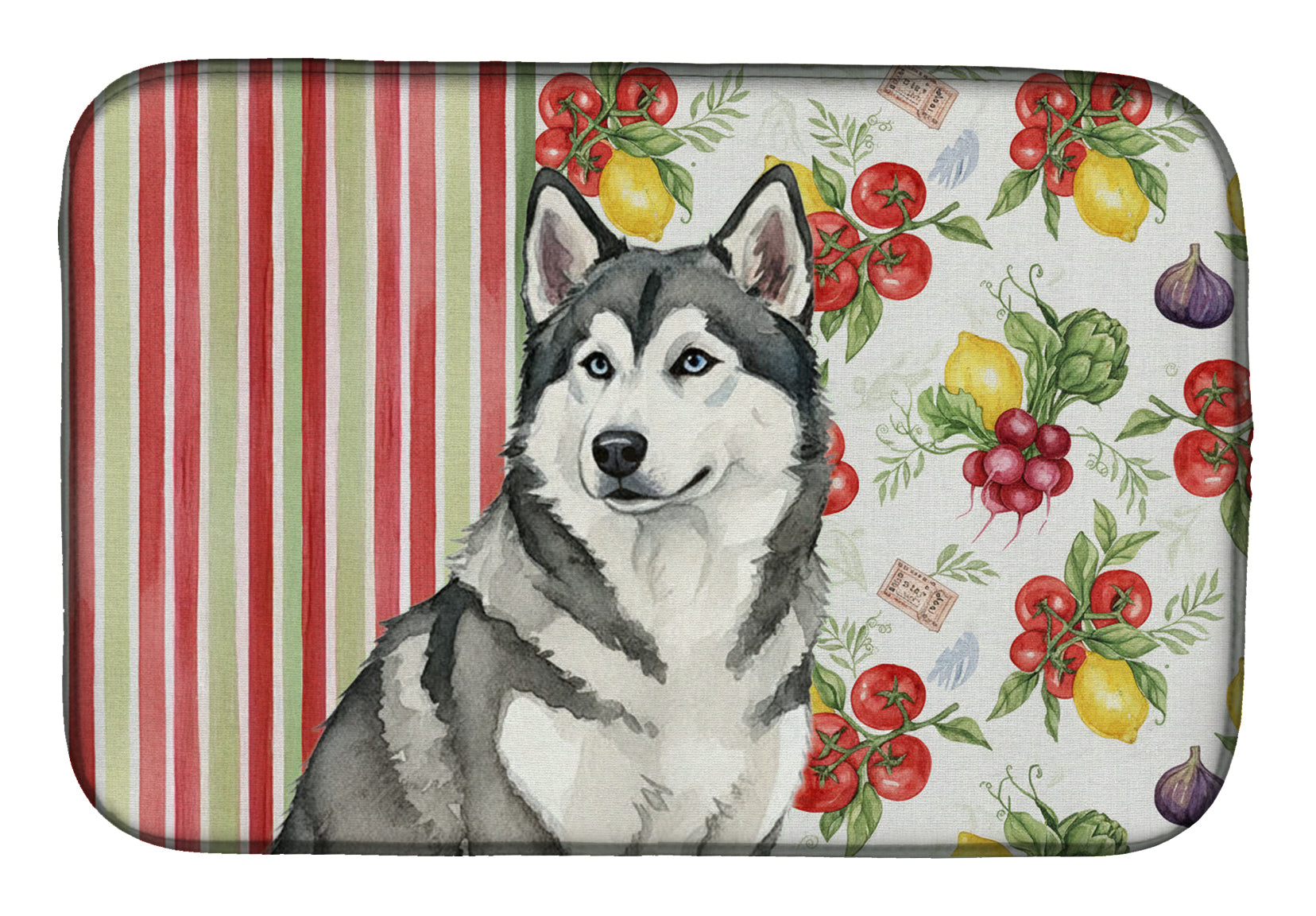 Shown here is the Gray and White Alaskan Malamute Vegetables Dish Drying Mat from Caroline's Treasures featuring artwork of a Alaskan Malamute in a Everyday design. The detailed illustration and vibrant colors make it a standout accent that celebrates both seasonal style and love for the subject. This image features a vibrant watercolor vegetable pattern with tomatoes, lemons, artichokes, figs, radishes, and leafy greens arranged in a repeating design, paired with classic red and green stripes. The bright, garden-fresh palette creates a cheerful, farmhouse-inspired look that feels lively, welcoming, and perfect for kitchen décor. Everyday décor celebrates personal style and the small moments that make a house feel like home. Thoughtful designs add warmth and personality that can be enjoyed year-round. Say goodbye to messy countertops and soggy dish towels with our innovative dish drying mat. Our high-quality dish drying pad is designed to keep your countertops dry while offering a stylish and efficient solution. Whether you're air drying dishes, glasses, stemware, silverware, pots, pans, bottles, or even fruits and vegetables, our dish mat is the perfect choice. The 14 inches x 21 inches size fits most counters and dish drying racks, and the non-slip design ensures stability. Made with water-absorbent polyester and a polyurethane foam insert, our dish drying mat is not only functional but also durable. It's machine washable and printed in the USA for long-lasting use. The beautiful artwork adds flair to your kitchen decor, making it a perfect housewarming gift or present for any occasion. Upgrade your kitchen experience with our absorbent and versatile dish drying mat. Perfect for: Kitchen counters and sinks, everyday dish drying and countertop protection, Dogs-themed homes, or year-round use for Alaskan Malamute lovers. Alaskan Malamutes are strong working dogs known for their endurance, loyalty, and friendly disposition. Bred for hauling and cold climates, this powerful northern breed is cherished for its affectionate nature and impressive strength. Makes a heartfelt gift for: Alaskan Malamute owners, Dogs lovers, Everyday gifts, pet parents, friends who adore their Alaskan Malamute, or anyone celebrating Dogs.