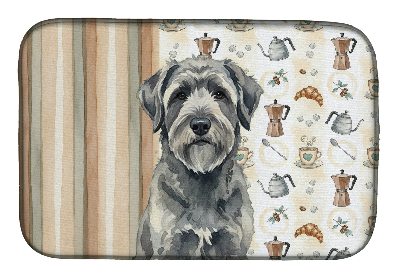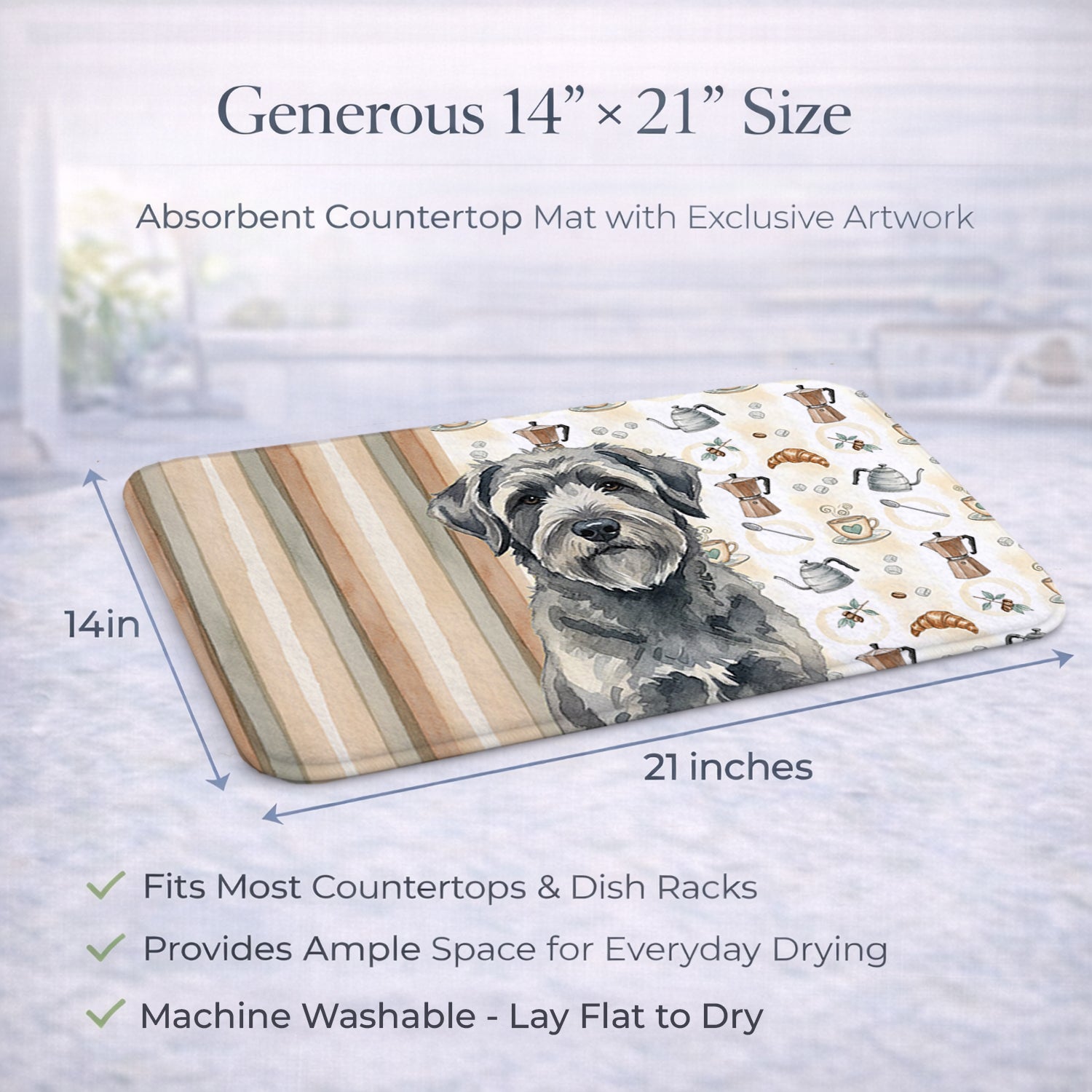 Shown here is the Gray Bouvier des Flandres Coffee Bar Dish Drying Mat from Caroline's Treasures featuring artwork of a Bouvier des Flandres in a Everyday design. The detailed illustration and vibrant colors make it a standout accent that celebrates both seasonal style and love for the subject. This image features a cozy watercolor coffee-themed pattern with illustrated mugs, moka pots, kettles, croissants, coffee beans, and sugar cubes arranged in a repeating design. Soft neutral tones with warm browns, creams, and subtle sage accents create an inviting, café-inspired look that feels comforting and relaxed. Everyday décor celebrates personal style and the small moments that make a house feel like home. Thoughtful designs add warmth and personality that can be enjoyed year-round. Say goodbye to messy countertops and soggy dish towels with our innovative dish drying mat. Our high-quality dish drying pad is designed to keep your countertops dry while offering a stylish and efficient solution. Whether you're air drying dishes, glasses, stemware, silverware, pots, pans, bottles, or even fruits and vegetables, our dish mat is the perfect choice. The 14 inches x 21 inches size fits most counters and dish drying racks, and the non-slip design ensures stability. Made with water-absorbent polyester and a polyurethane foam insert, our dish drying mat is not only functional but also durable. It's machine washable and printed in the USA for long-lasting use. The beautiful artwork adds flair to your kitchen decor, making it a perfect housewarming gift or present for any occasion. Upgrade your kitchen experience with our absorbent and versatile dish drying mat. Perfect for: Kitchen counters and sinks, everyday dish drying and countertop protection, Dogs-themed homes, or year-round use for Bouvier des Flandres lovers. Bouviers des Flandres are powerful herding dogs known for their intelligence and protective instincts. This versatile working breed is respected for its loyalty and steady temperament. Makes a heartfelt gift for: Bouvier des Flandres owners, Dogs lovers, Everyday gifts, pet parents, friends who adore their Bouvier des Flandres, or anyone celebrating Dogs.
