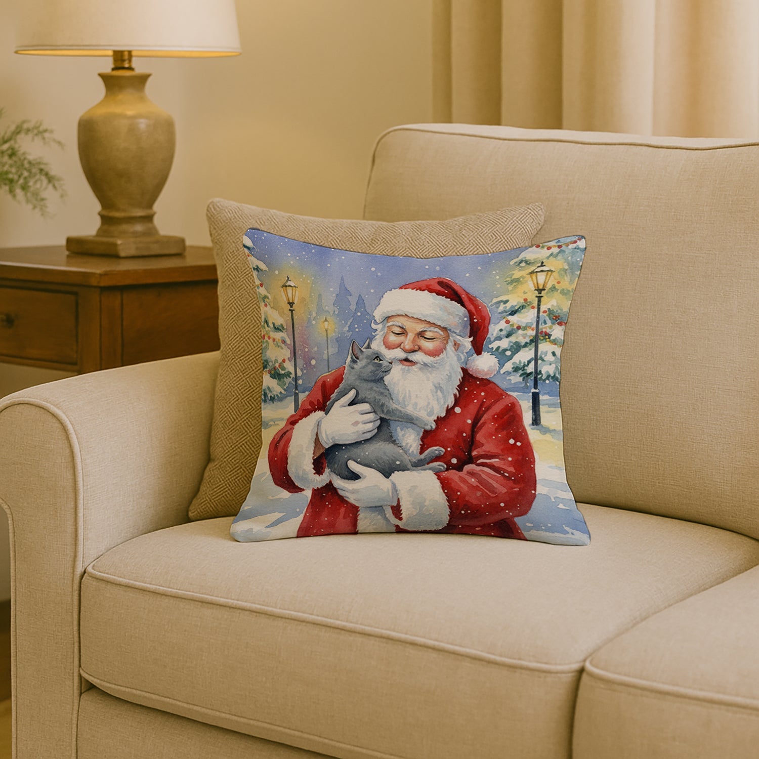 Throw Pillow featuring breed specific Gray Cat artwork. Celebrate Christmas with this Christmas Pillow. Revitalize your outdoor or indoor living space with Caroline's Treasures 18x18 Fabric Decorative Pillow. With a generously sized dimension of approximately 18 inches by 18 inches, this pillow makes a comfortable and aesthetic addition to any seating area. Made from a unique, water-resistant material developed by Caroline's Treasures, the pillow sham is 100% polyester fabric that's durable and ready to weather any condition. Its vibrant, full-color artwork will not fade over time as it is dyed with color-fast dyes. Whether you place it on your patio furniture, porch, veranda, or indoor couch, its soft canvas fabric ensures a cozy experience. The pillow is handcrafted in the United States, featuring a sham created from three pieces of fabric and a polyester insert for enduring shape and overstuffed comfort. Despite being robustly built to endure the outdoors, it is as soft and snug as your favorite indoor cushions. Please note, as all our pillows are handmade, sizes may vary slightly, adding to the charm of this unique decorative item.