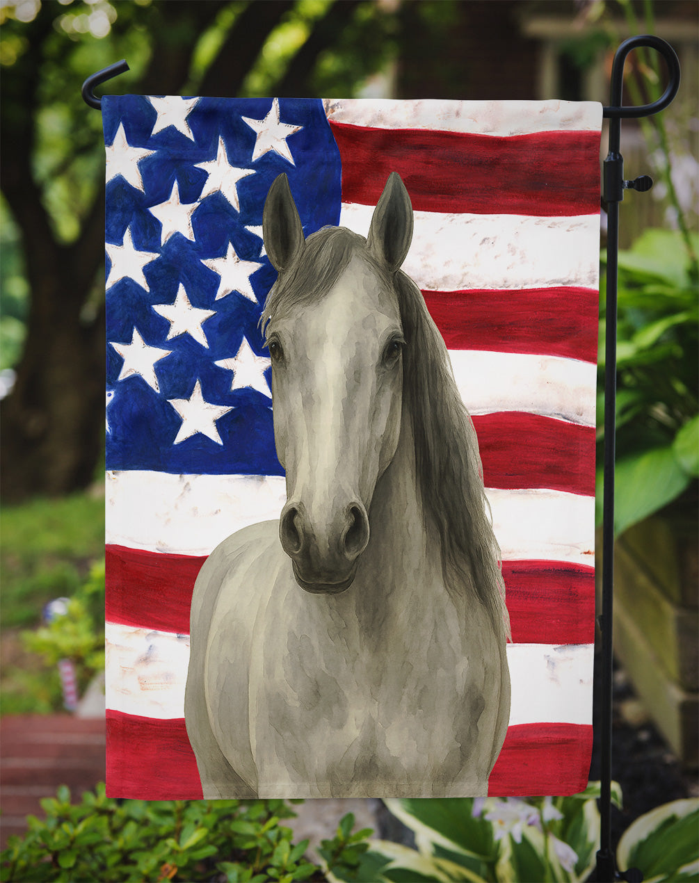 Garden Flag featuring breed specific Hanoverian artwork. Enhance the beauty of your garden, patio, or yard with Caroline's Treasures Decorative Garden Flag, proudly made in the USA. Crafted from two pieces of thick, double-sided polyester fabric, this 2-ply garden flag is designed to withstand various weather conditions, making it water-resistant and weatherproof. Featuring correctly readable words on both sides, this garden flag offers a delightful visual experience from any angle. With its heavier weight, it stands out among other garden flags, ensuring stability and durability even in wind, rain, and snow. Measuring approximately 11 1/4 inches by 15 1/2 inches, this flag allows you to personalize your outdoor decor. It comes with a 1 1/2-inch sleeve sewn in, allowing easy attachment to any standard garden flag stand or garden size porch hanger (sold separately). Make a statement in your outdoor space with Caroline's Treasures Decorative Garden Flag, a vibrant and high-quality flag that adds color and personality to your surroundings. Proudly made in the USA, it's a symbol of quality craftsmanship and attention to detail.