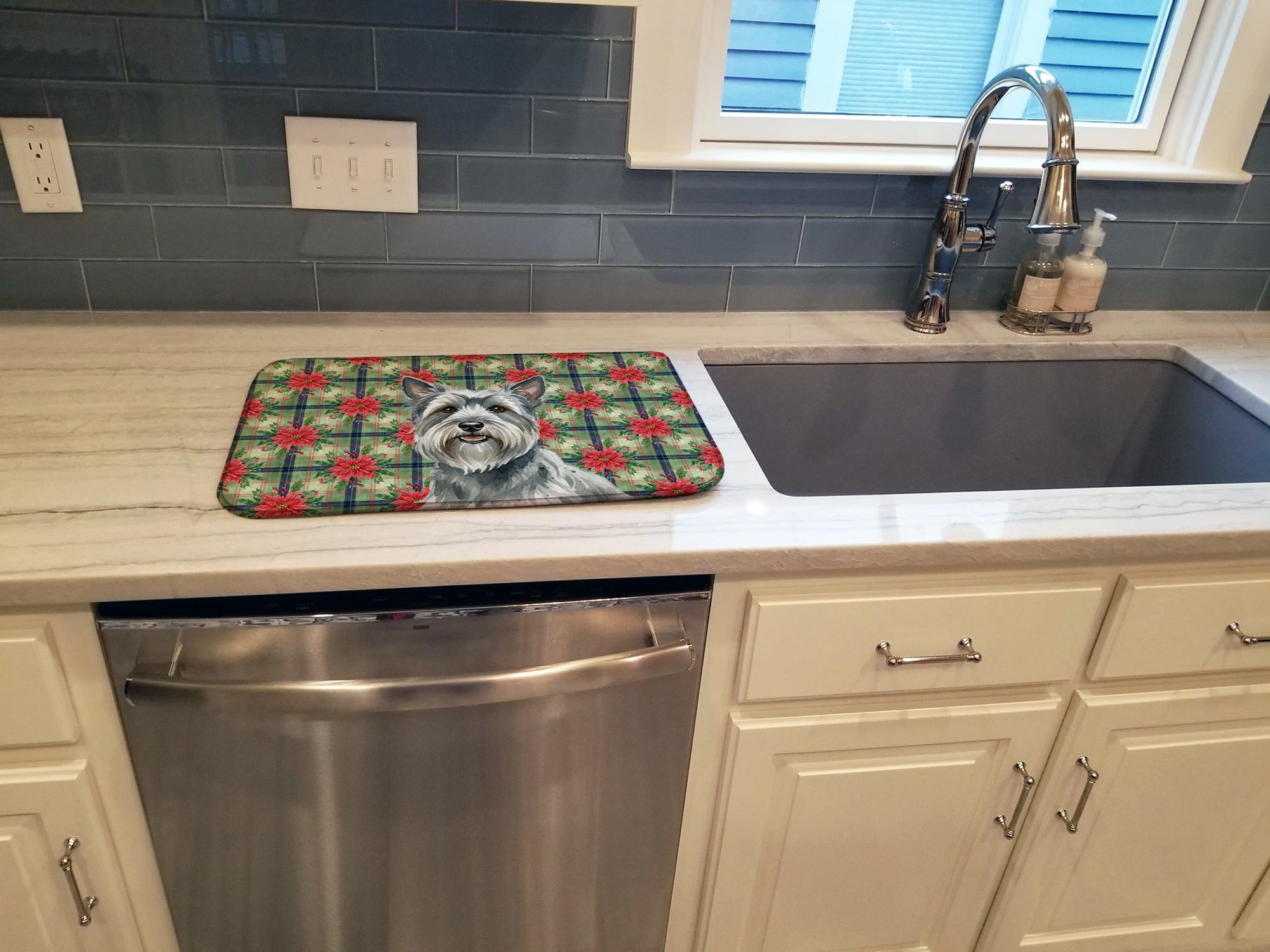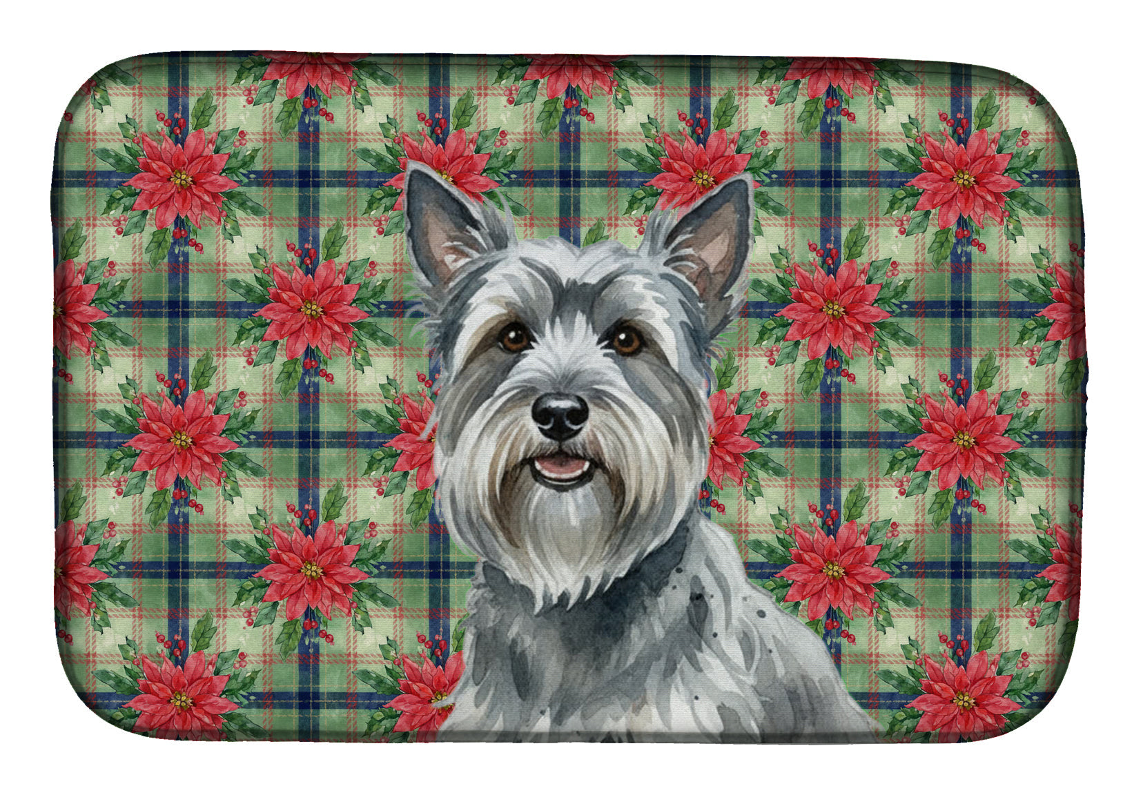 Dish Drying Mat featuring breed specific Skye Terrier artwork. Celebrate Christmas with this Christmas Dish Drying Mat. Say goodbye to messy countertops and soggy dish towels with our innovative dish drying mat. Our high-quality dish drying pad is designed to keep your countertops dry while offering a stylish and efficient solution. Whether you're air drying dishes, glasses, stemware, silverware, pots, pans, bottles, or even fruits and vegetables, our dish mat is the perfect choice. The 14 inches x 22 inches size fits most counters and dish drying racks, and the non-slip design ensures stability. Made with water-absorbent polyester and a polyurethane foam insert, our dish drying mat is not only functional but also durable. It's machine washable and printed in the USA for long-lasting use. The beautiful artwork adds flair to your kitchen decor, making it a perfect housewarming gift or present for any occasion. Upgrade your kitchen experience with our absorbent and versatile dish drying mat.