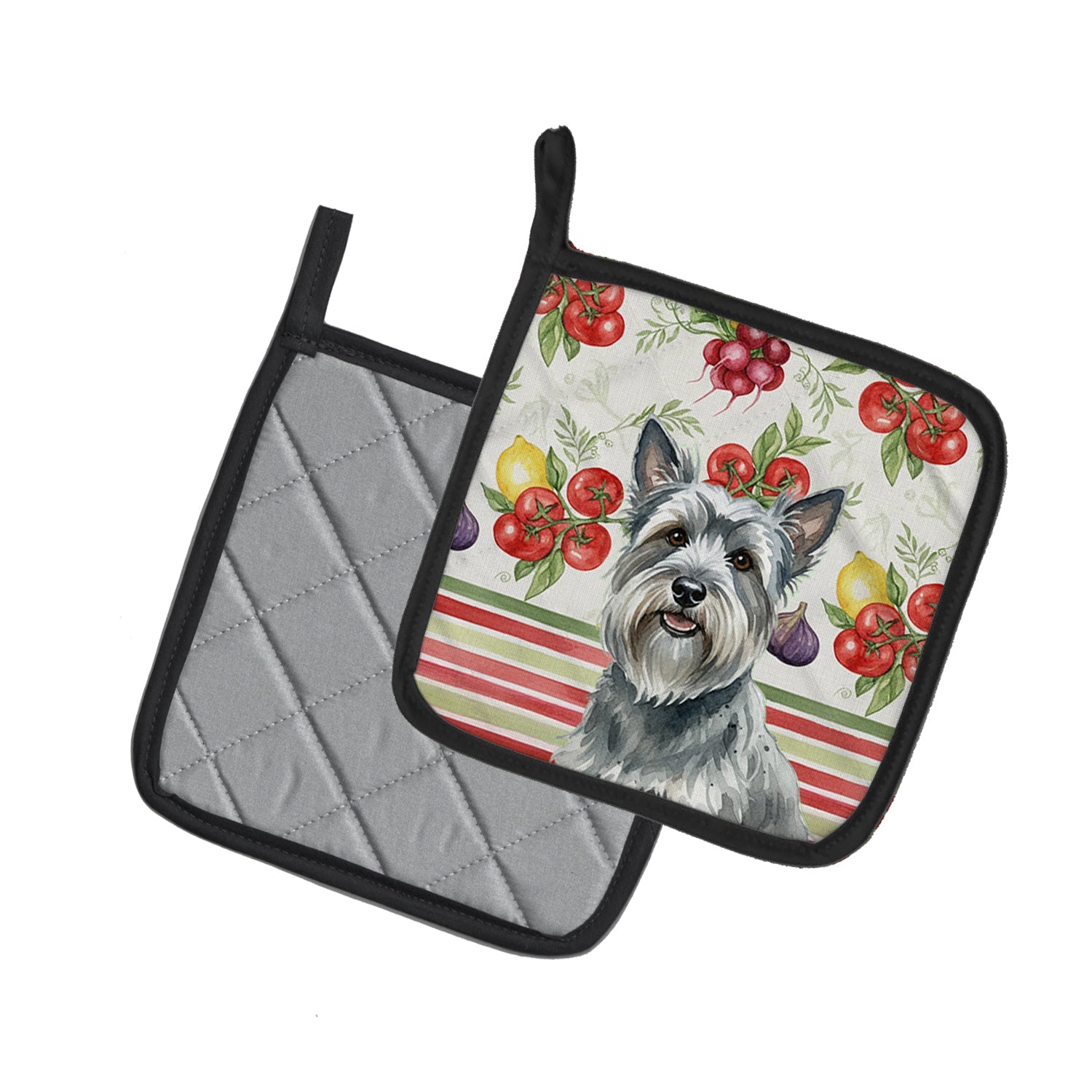 Pair of Pot Holders featuring breed specific Skye Terrier artwork. Add warmth, personality, and function to your kitchen with our Vegetables Pot Holder Pair. Each set includes two quilted hot pads, featuring original full-color watercolor artwork on a soft polyester front accented by black trim. Crafted with multiple layers for performance: Top Layer: Vibrant artwork permanently dyed into polyester fabric. Middle Layer: US-manufactured insulated material with breathable polyester fibers and a reflective metalized film that reflects heat back to its source. Bottom Layer: A silver heat-resistant backing for extra protection. Each pot holder measures 7.5" x 7.5", includes a hanging tab, and is quilted for durability. Use them to protect your hands, countertops, and tabletops — or as decorative trivets for Thanksgiving, Christmas, or everyday meals.