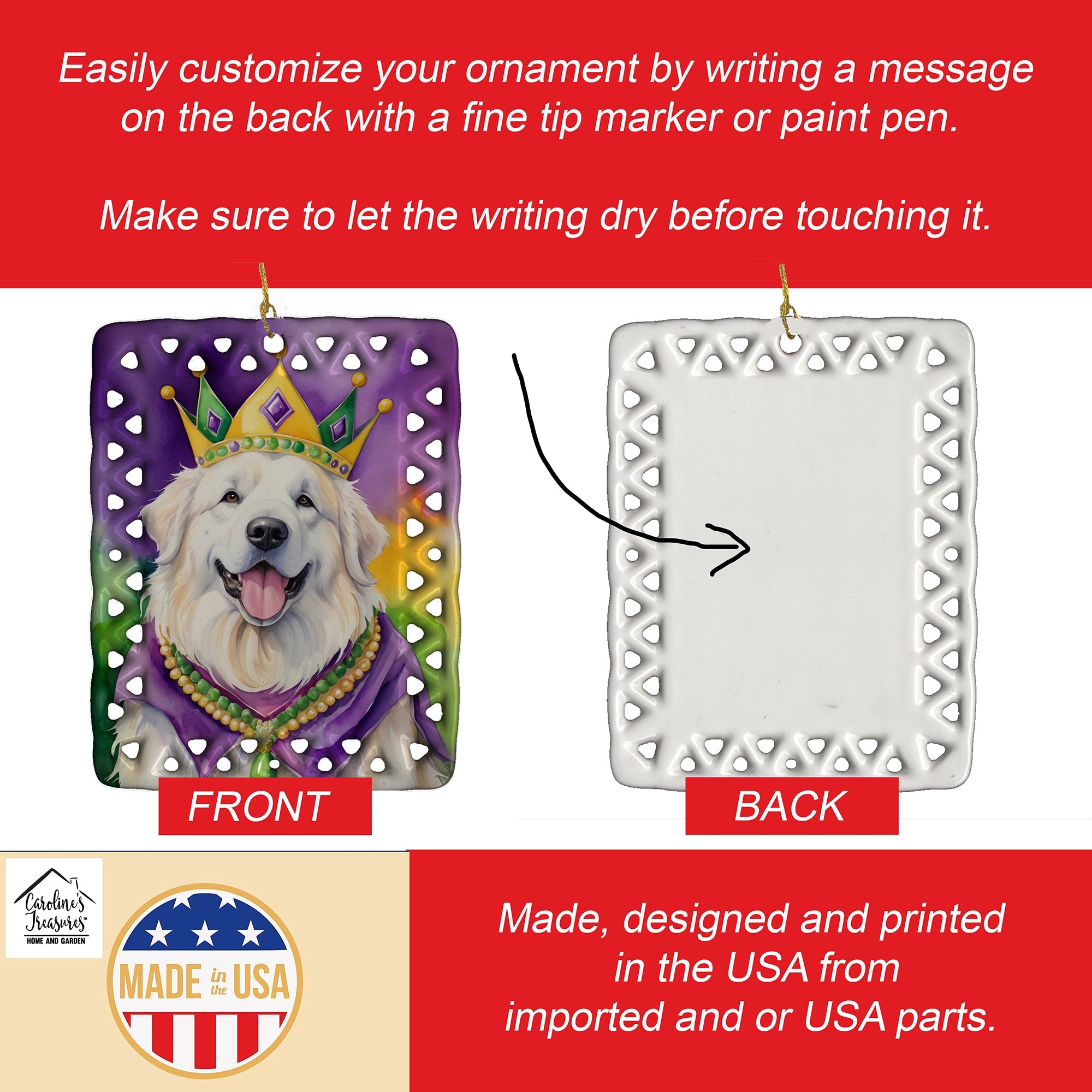 Porcelain Ornament featuring breed specific Great Pyrenees artwork. Celebrate Mardi Gras with this Mardi Gras Ornament. Add a unique, personal touch to your holiday decor with our Rectangular Lattice Porcelain Ornament. Perfect for creating cherished memories, this high-quality ornament shines under festive lights, reflecting warmth and joy throughout your Christmas tree. Crafted with a glossy finish, it showcases vibrant, full-color artwork contributed by our talented artists, ensuring your tree is adorned with a burst of color and holiday spirit. What sets this Porcelain Ornament apart is its customizable white back. Use a paint pen or permanent marker to write a heartfelt message, commemorate a special year, or mark an unforgettable date, turning this ornament into a keepsake that will be treasured for years to come. For best results, allow any personalization to dry thoroughly before handling. Each ornament comes complete with a delicate gold cord, making it easy to hang and display. Proudly made in the USA, this ornament measures 3.375 x 2.625 inches and is a thoughtful gift for pet sitters, teachers, family members, or anyone who would appreciate a little extra holiday magic. Bring style, charm, and a touch of personal meaning to your Christmas tree with this beautifully designed ornament..