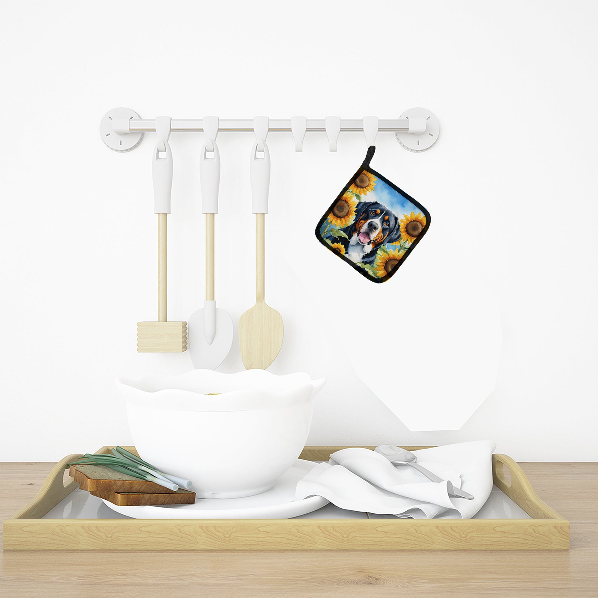 Greater Swiss Mountain Dog in Sunflowers Pot Holders - Set of 2 Decorative Kitchen Helpers | Made in the USA