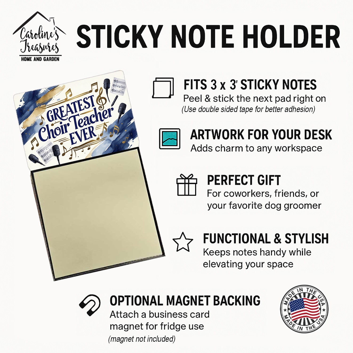 Celebrate the educators who inspire every day with this funny teacher sticky note holder from Caroline’s Treasures. Proudly made in the USA, each design features the phrase Greatest Choir Teacher Ever - in bold, colorful artwork that turns an everyday desk accessory into a thoughtful gift. The sturdy base holds 3" x 3" sticky notes securely while you write, and the glossy aluminum art plate adds a durable, fade-resistant finish that lasts. Refilling is easy—just roll a piece of tape around your finger, press it to the back sheet of a new pad, and attach it to the board. Ideal for classrooms, offices, or home desks, these note holders make a meaningful gift for Teacher Appreciation Week, back-to-school, end-of-year celebrations, or simply saying thank you.
