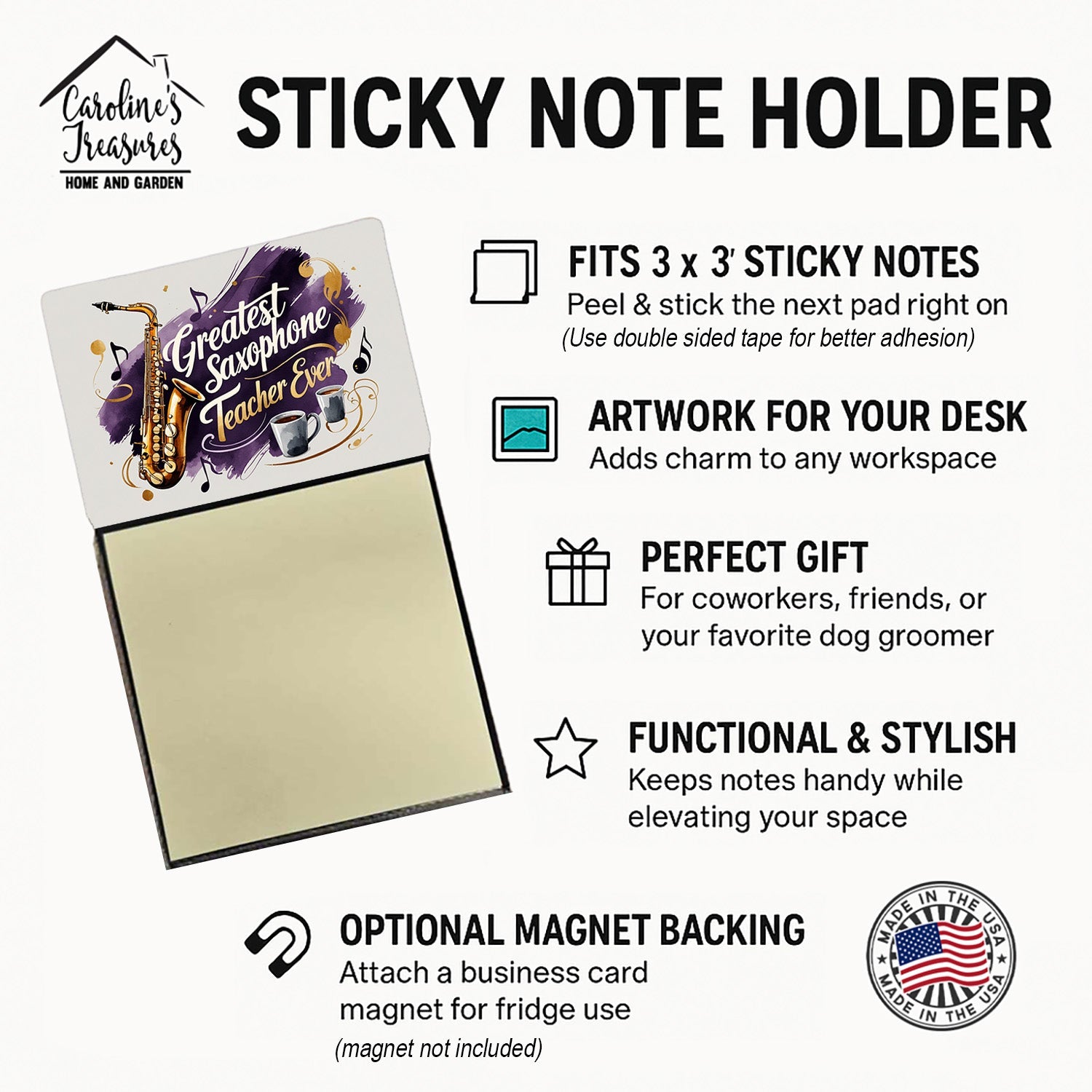 Celebrate the educators who inspire every day with this funny teacher sticky note holder from Caroline’s Treasures. Proudly made in the USA, each design features the phrase Greatest Saxophone Teacher Ever - in bold, colorful artwork that turns an everyday desk accessory into a thoughtful gift. The sturdy base holds 3" x 3" sticky notes securely while you write, and the glossy aluminum art plate adds a durable, fade-resistant finish that lasts. Refilling is easy—just roll a piece of tape around your finger, press it to the back sheet of a new pad, and attach it to the board. Ideal for classrooms, offices, or home desks, these note holders make a meaningful gift for Teacher Appreciation Week, back-to-school, end-of-year celebrations, or simply saying thank you.