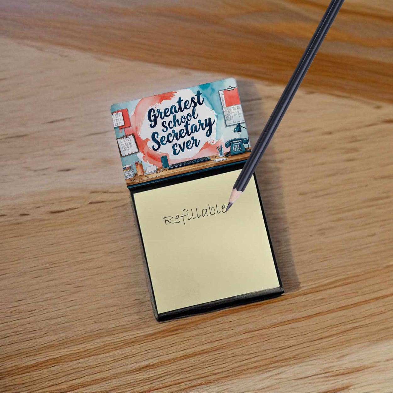 Celebrate the educators who inspire every day with this funny teacher sticky note holder from Caroline’s Treasures. Proudly made in the USA, each design features the phrase Greatest School Secretary Ever - in bold, colorful artwork that turns an everyday desk accessory into a thoughtful gift. The sturdy base holds 3" x 3" sticky notes securely while you write, and the glossy aluminum art plate adds a durable, fade-resistant finish that lasts. Refilling is easy—just roll a piece of tape around your finger, press it to the back sheet of a new pad, and attach it to the board. Ideal for classrooms, offices, or home desks, these note holders make a meaningful gift for Teacher Appreciation Week, back-to-school, end-of-year celebrations, or simply saying thank you.