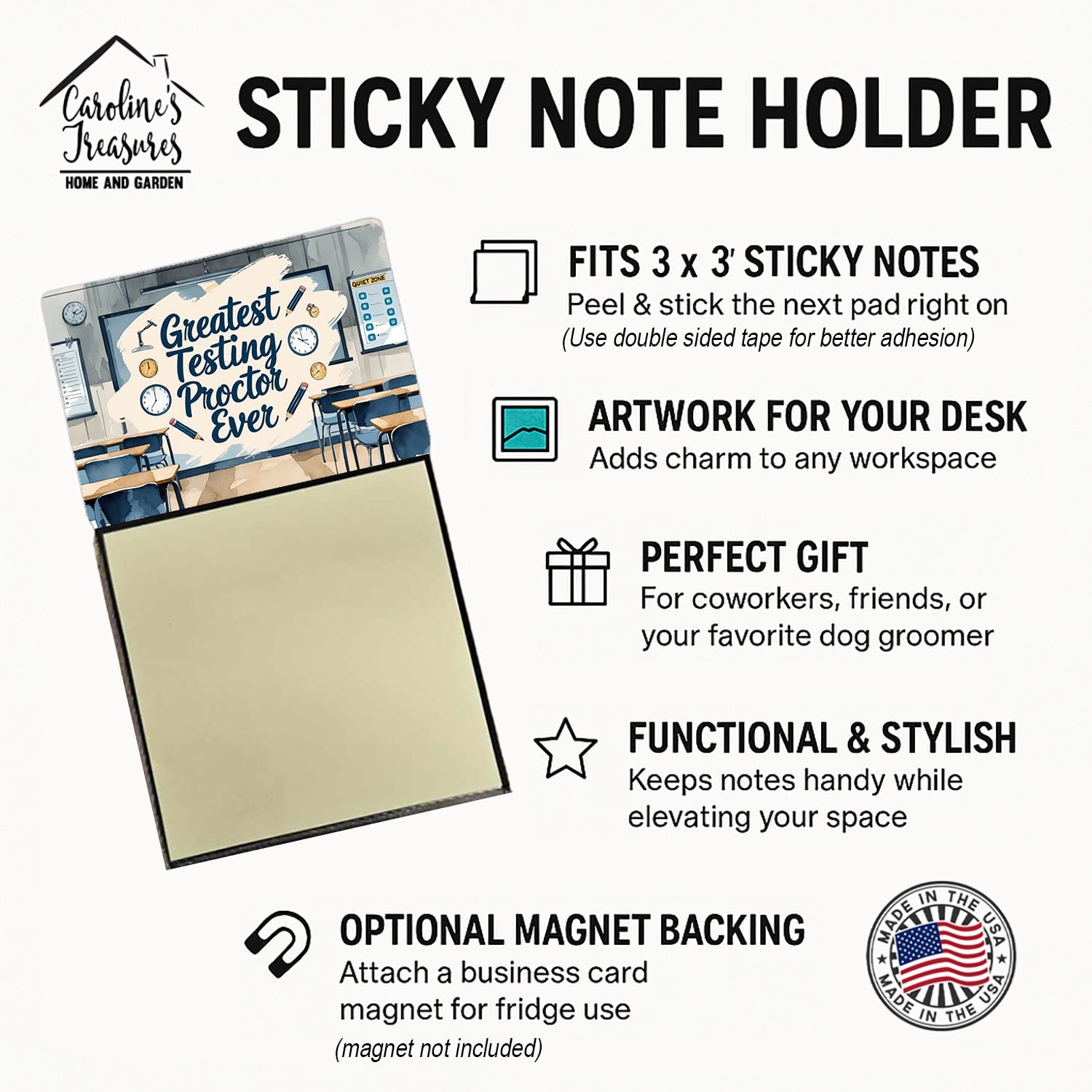 Celebrate the educators who inspire every day with this funny teacher sticky note holder from Caroline’s Treasures. Proudly made in the USA, each design features the phrase Greatest Testing Proctor Ever - in bold, colorful artwork that turns an everyday desk accessory into a thoughtful gift. The sturdy base holds 3" x 3" sticky notes securely while you write, and the glossy aluminum art plate adds a durable, fade-resistant finish that lasts. Refilling is easy—just roll a piece of tape around your finger, press it to the back sheet of a new pad, and attach it to the board. Ideal for classrooms, offices, or home desks, these note holders make a meaningful gift for Teacher Appreciation Week, back-to-school, end-of-year celebrations, or simply saying thank you.