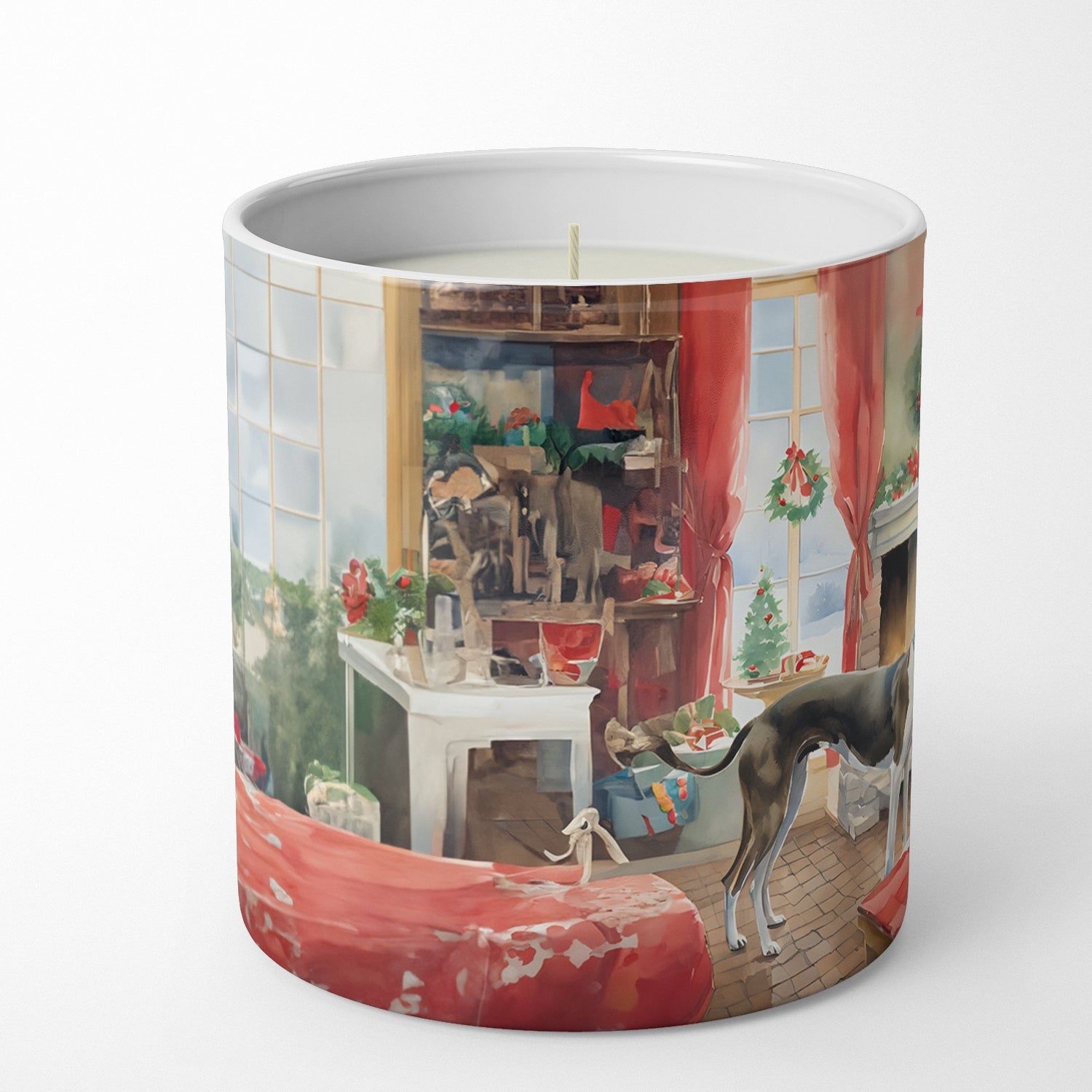 Decorate your space with our Christmas Greyhound artwork on a 10 oz Soy Candle. Upgrade your ambiance with our Decorative Soy Wax Candle. No more settling for ordinary candles. With a beautifully designed 10 oz container adorned with exclusive artwork from our artists, this candle not only illuminates your space but also adds a touch of elegance to your decor. Crafted with meticulous care, each candle is hand-poured and made from 100% soy wax, ensuring a clean, consistent burn. Free from chemical-based dyes, the all-white wax complements any setting. Our soy wax is paired with high-quality fragrance oils, releasing a robust scent that transforms your surroundings. The candle provides a great deal of burn time, though this may vary based on air flow, burn duration, and wick maintenance. For safe use, always trim the wick to 1/4 inch before lighting and ensure your candle is on a level surface. We recommend not burning for more than four hours at a time and discontinuing use when only 1/4 inch of wax remains. Our Decorative Soy Wax Candle is more than just a candle. It is a piece of art that enhances your space while ensuring a soothing, fragrant ambiance. Remember, always burn within sight, and keep away from flammable objects, pets, and children. Enjoy the beauty and tranquility it brings to your everyday life.
