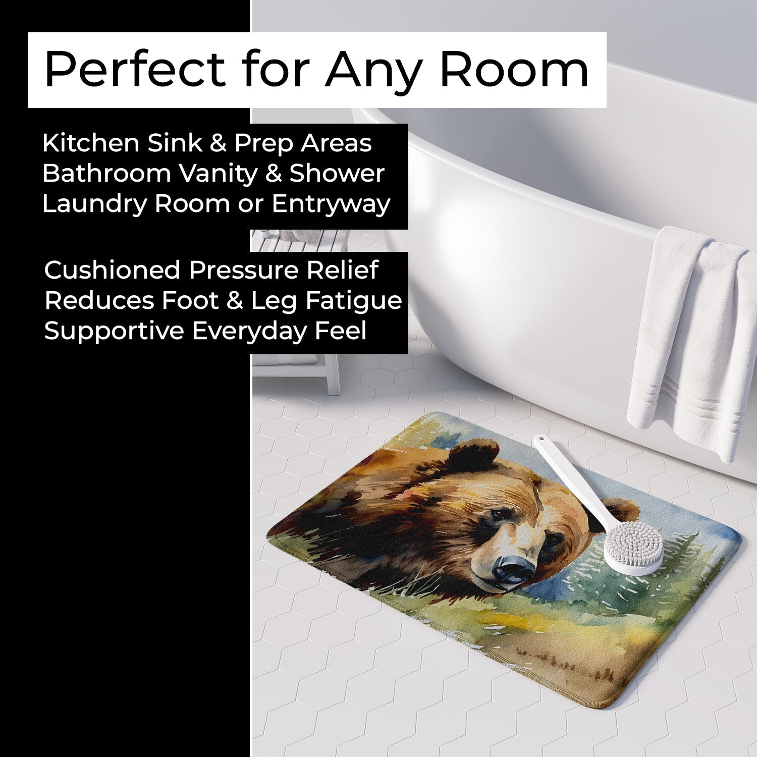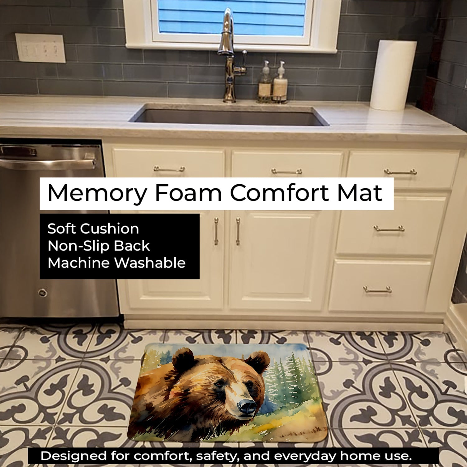 Shown here is the Grizzly Bear Memory Foam Kitchen Mat from Caroline's Treasures featuring artwork of a Grizzly Bear in a Everyday design. The detailed illustration and vibrant colors make it a standout accent that celebrates both seasonal style and love for the subject. Bring the beauty of nature indoors with our Watercolor Wildlife Collection. Featuring artistic, hand-painted wildlife designs in soft watercolor tones, this collection adds serene charm and uplifting style to home décor and thoughtful gifts for nature lovers. Everyday décor celebrates personal style and the small moments that make a house feel like home. Thoughtful designs add warmth and personality that can be enjoyed year-round. Transform your floor into a work of art with Caroline's Treasures' Memory Foam Mat. This mat offers not only a stunning visual appeal but also a luxurious, plush feel that's incredibly comfortable to the touch. It's a versatile, machine-washable mat designed for both bath and kitchen use, ensuring you experience the best in comfort and convenience. Care Instructions: Maintaining this memory foam mat is a breeze. Simply follow the care instructions on the product tag. It's recommended to wash in cold water and dry on a low-temperature setting in the dryer. This ensures the mat retains its quality and longevity, allowing you to enjoy its beauty and comfort for a long time. Caroline's Treasures' Memory Foam Mat Machine Washable is the perfect blend of artistry, comfort, and practicality, making it a standout addition to any space. Upgrade your home decor with this versatile and stylish mat today. Grizzly bears are large bears with powerful builds and thick fur. Their presence reflects strength and wilderness. Makes a heartfelt gift for: Grizzly Bear owners, Wild Animals lovers, Everyday gifts, pet parents, friends who adore their Grizzly Bear, or anyone celebrating Wild Animals.