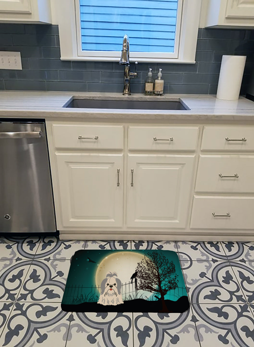 Halloween Scary Shih Tzu Silver White Machine Washable Memory Foam Mat BB2275RUG