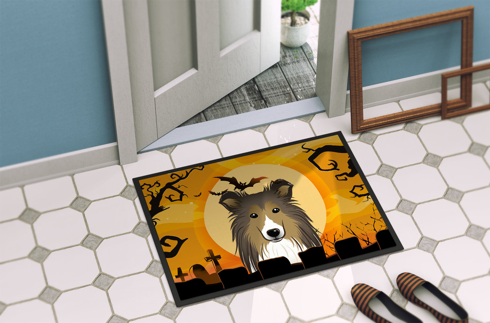 Decorate your space with our Halloween Sheltie/Shetland Sheepdog artwork on a Doormat. Welcome your guests in style with our Artwork Door Mat, designed to withstand almost any weather condition. This mat, measuring approximately 24 by 36 inches, is held together by durable black binding tape. Its top layer, composed of polyester felt, is dyed with the eye-catching image you see on the mat. A few layers below provide the mat with stability, while its rubber bottom is stamped to help prevent slipping and ensures safety. Our mat works wonderfully as both an indoor or outdoor door mat. For cleaning, simply hose it off with water or use a power washer - no need for any cleaner that produces suds. Avoid scrubbing with a brush, instead, opt for the vacuum on floor setting. Designed manufactured and printed in the USA, this mat is a perfect addition to your porch, outdoor kitchen, entryway, or any indoor space. Its unique design makes it a charming decorative rug that greets your guests and adds a stylish touch to your home decor.