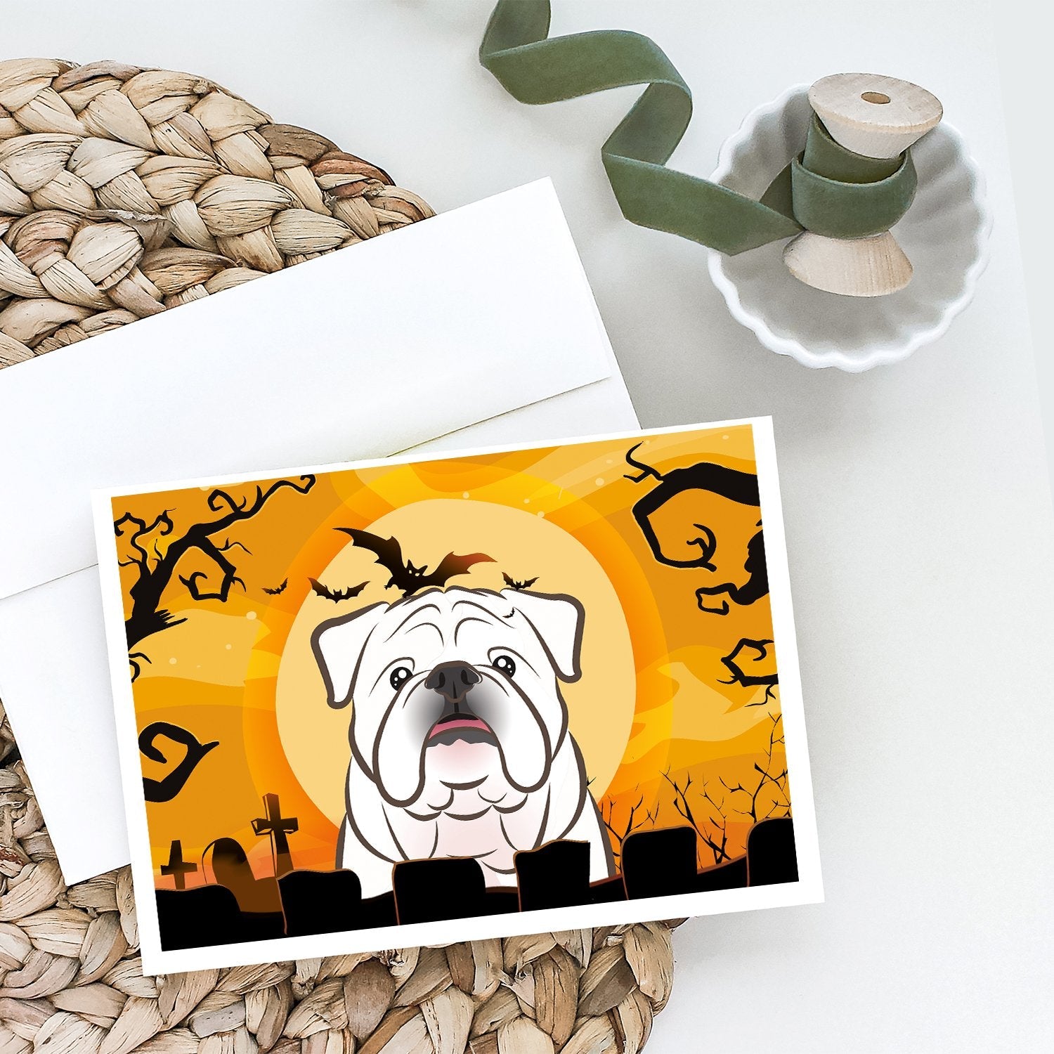 Decorate your space with our Halloween Bulldog, English Bulldog artwork on a . Celebrate special moments with Caroline's Treasures Printed Greeting Card Pack. This pack includes eight beautifully folded 5x7 cards, accompanied by eight matching white envelopes. With blank interiors, these cards provide ample space for your personalized messages and heartfelt holiday greetings. Each card features captivating full-color artwork, meticulously printed in our facility on high-quality 80 lb cover stock or 216 GSM. The super smooth finish of the white cards enhances the visual impact of the artwork, creating a truly stunning presentation. Designed by our talented in-house artists or licensed artists, the artwork on these cards showcases their creativity and attention to detail. From vibrant illustrations to captivating designs, each card tells its own unique story. Whether it's for birthdays, anniversaries, holidays, or any special occasion, Caroline's Treasures Greeting Card Pack is the perfect way to convey your heartfelt sentiments. Share joy, love, and warm wishes with these exquisite cards and make every moment unforgettable.
