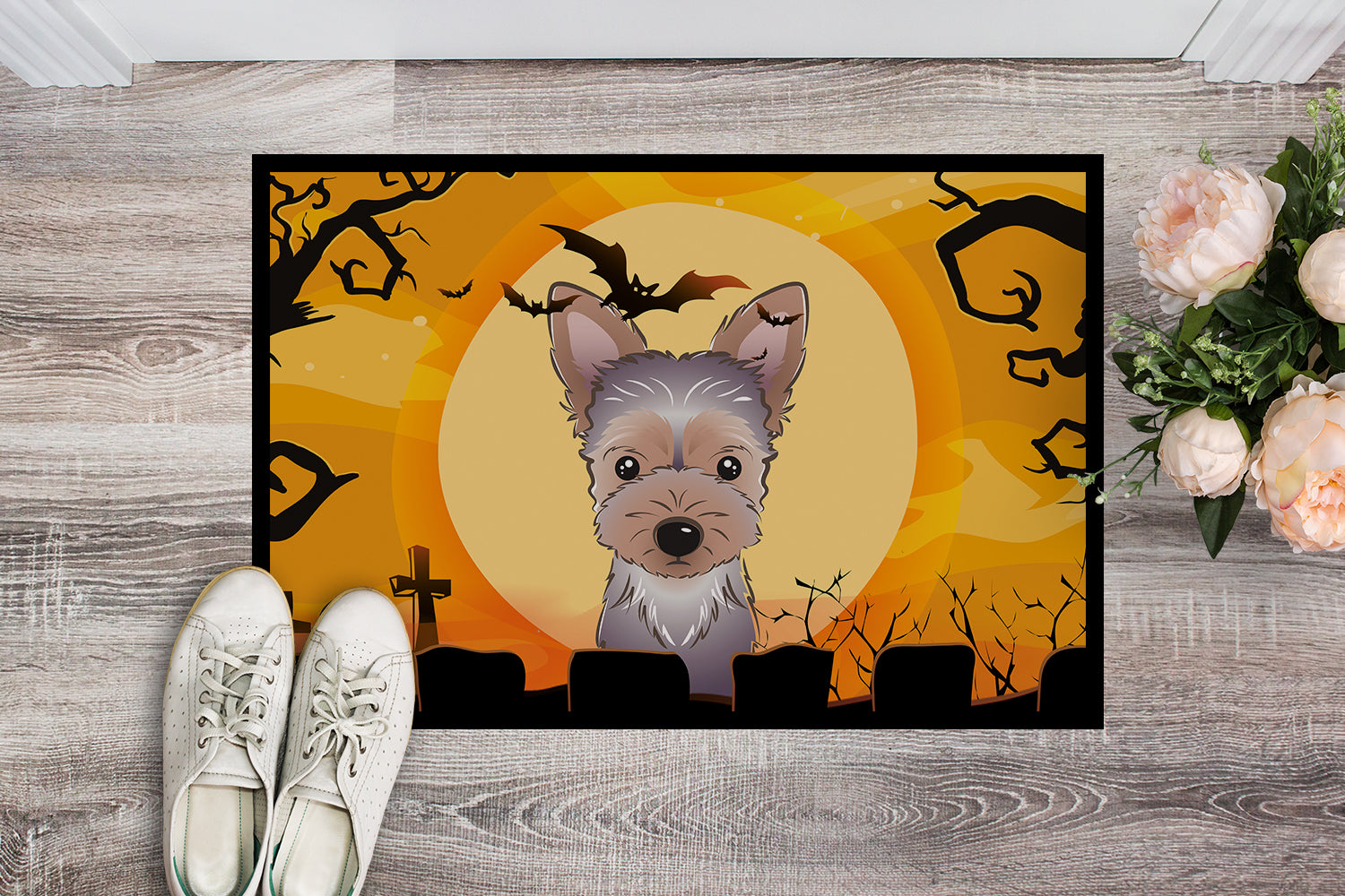 Decorate your space with our Halloween Yorkshire Terrier artwork on a Doormat. Welcome your guests in style with our Artwork Door Mat, designed to withstand almost any weather condition. This mat, measuring approximately 24 by 36 inches, is held together by durable black binding tape. Its top layer, composed of polyester felt, is dyed with the eye-catching image you see on the mat. A few layers below provide the mat with stability, while its rubber bottom is stamped to help prevent slipping and ensures safety. Our mat works wonderfully as both an indoor or outdoor door mat. For cleaning, simply hose it off with water or use a power washer - no need for any cleaner that produces suds. Avoid scrubbing with a brush, instead, opt for the vacuum on floor setting. Designed manufactured and printed in the USA, this mat is a perfect addition to your porch, outdoor kitchen, entryway, or any indoor space. Its unique design makes it a charming decorative rug that greets your guests and adds a stylish touch to your home decor.