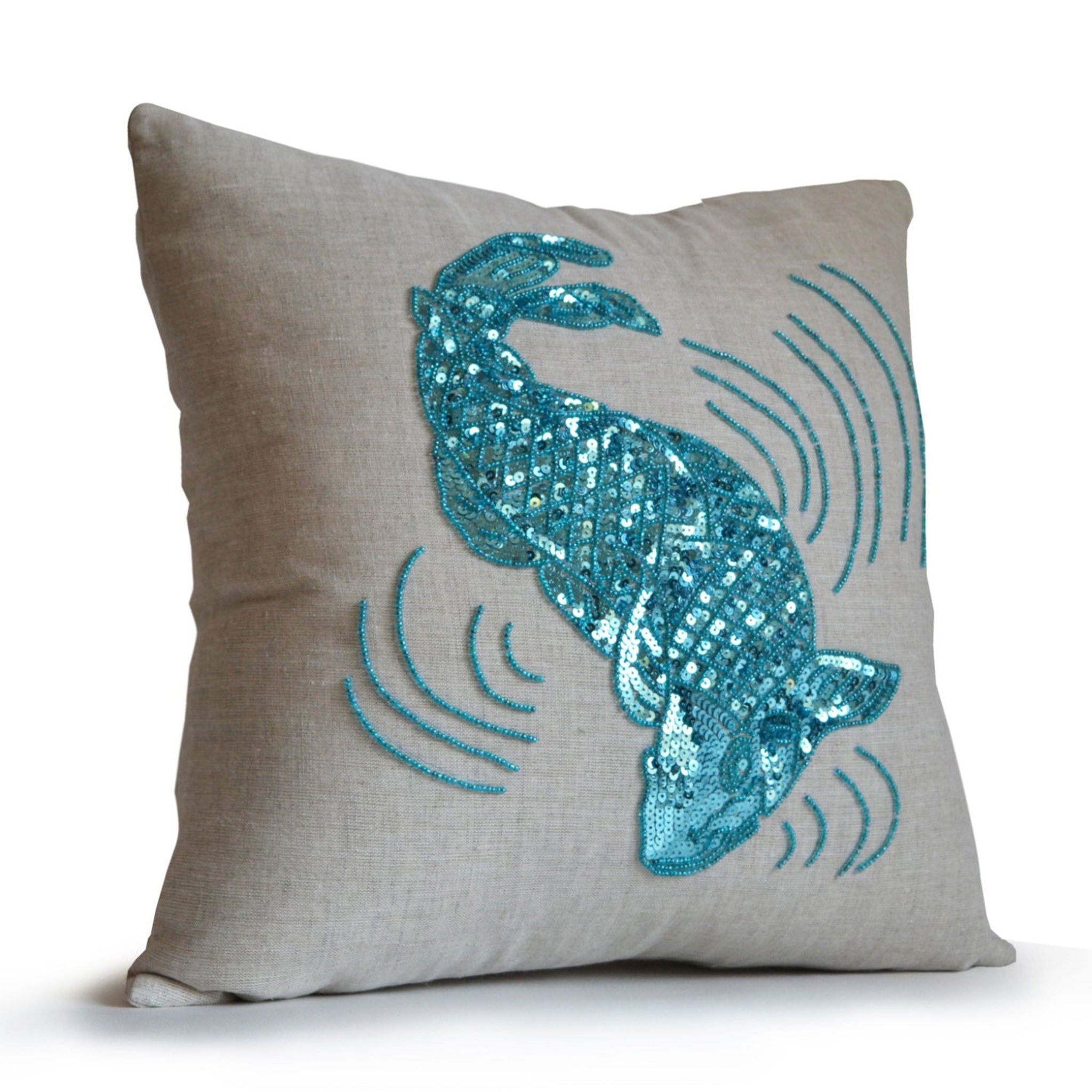 Oatmeal linen pillow cover with a the legendary koi fish in sparkling blue makes a classic accent especially in this muted color. One friendly carp swims across the middle of the pillow, revealing an elegant pattern reminiscent of rings in tranquil pond water. Crafted in stunning shades of blue this pillow is the perfect complement to your Asian-inspired decor.
