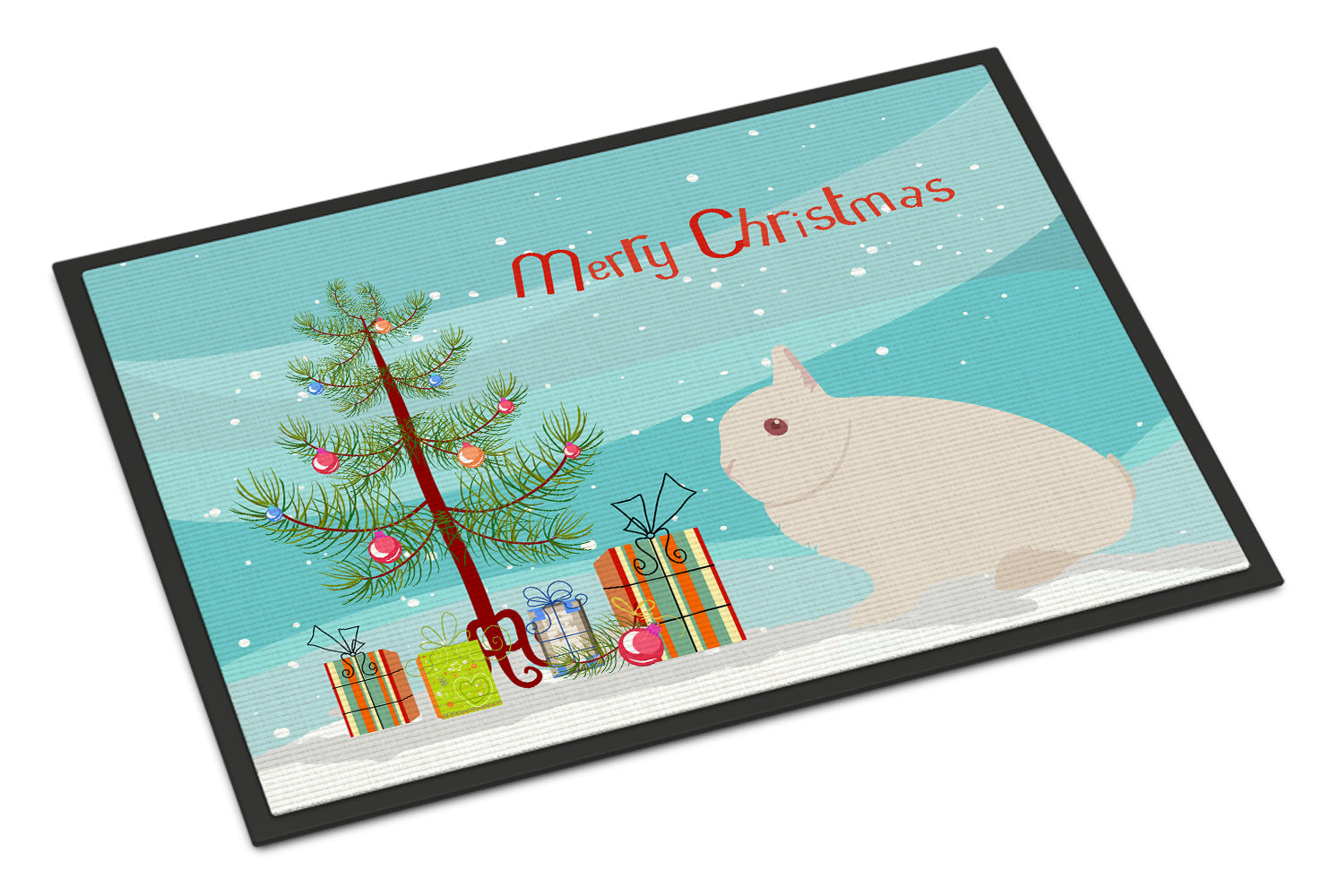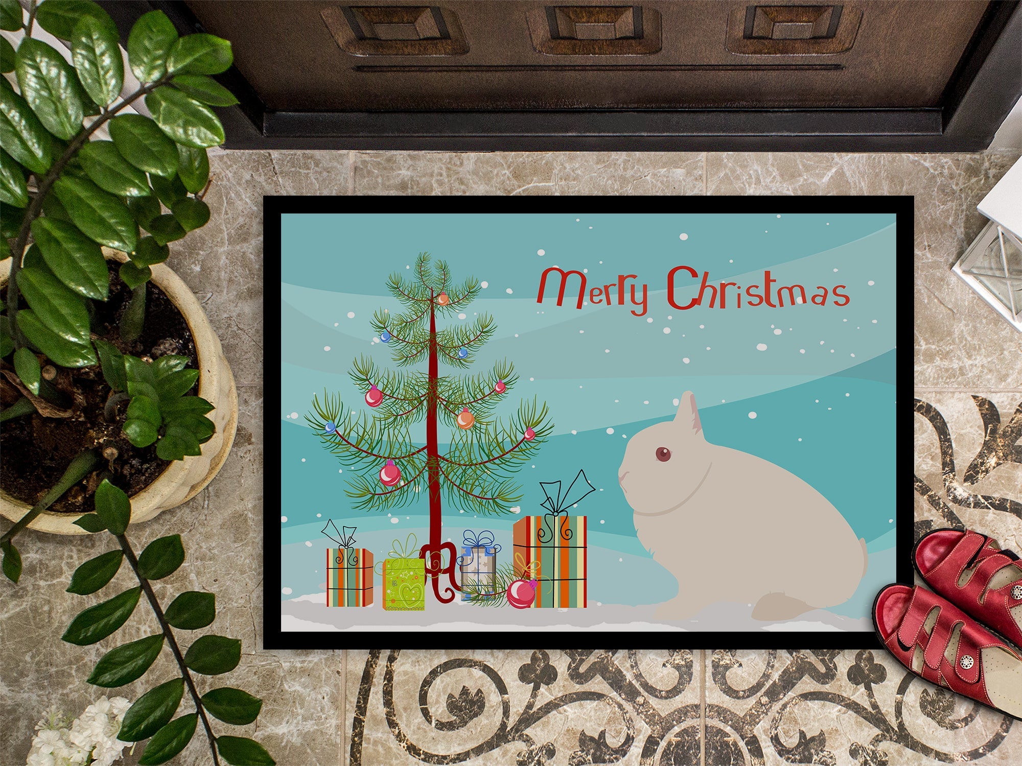 Decorate your space with our Christmas Hermelin Rabbit artwork on a Doormat. Welcome your guests in style with our Artwork Door Mat, designed to withstand almost any weather condition. This mat, measuring approximately 24 by 36 inches, is held together by durable black binding tape. Its top layer, composed of polyester felt, is dyed with the eye-catching image you see on the mat. A few layers below provide the mat with stability, while its rubber bottom is stamped to help prevent slipping and ensures safety. Our mat works wonderfully as both an indoor or outdoor door mat. For cleaning, simply hose it off with water or use a power washer - no need for any cleaner that produces suds. Avoid scrubbing with a brush, instead, opt for the vacuum on floor setting. Designed manufactured and printed in the USA, this mat is a perfect addition to your porch, outdoor kitchen, entryway, or any indoor space. Its unique design makes it a charming decorative rug that greets your guests and adds a stylish touch to your home decor.