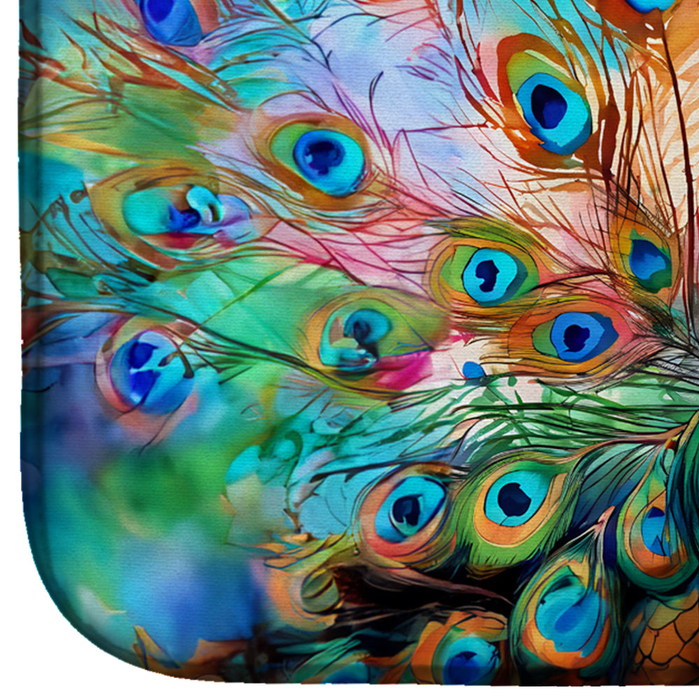 Dish Drying Mat featuring breed specific Peacock artwork. Say goodbye to messy countertops and soggy dish towels with our innovative dish drying mat. Our high-quality dish drying pad is designed to keep your countertops dry while offering a stylish and efficient solution. Whether you're air drying dishes, glasses, stemware, silverware, pots, pans, bottles, or even fruits and vegetables, our dish mat is the perfect choice. The 14 inches x 22 inches size fits most counters and dish drying racks, and the non-slip design ensures stability. Made with water-absorbent polyester and a polyurethane foam insert, our dish drying mat is not only functional but also durable. It's machine washable and printed in the USA for long-lasting use. The beautiful artwork adds flair to your kitchen decor, making it a perfect housewarming gift or present for any occasion. Upgrade your kitchen experience with our absorbent and versatile dish drying mat.