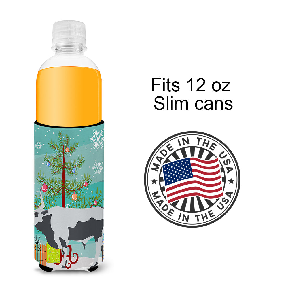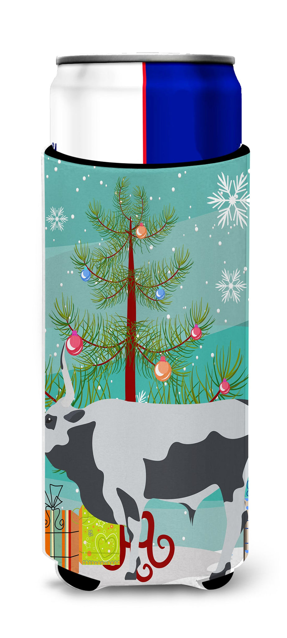 Decorate your space with our Christmas Hungarian Grey Steppe Cow artwork on a Slim Can Hugger. Elevate your beverage experience with our Slim Can Huggers, uniquely designed to fit a variety of your favorite 12 oz slim cans. Perfectly suited for Michelob Ultra, Starbucks Refreshers, Heineken Light, Bud Lite Lime, Dry Soda, Coors, Resin, Vitaminwater Energy, and Perrier Cans, our huggers ensure your drink stays refreshingly cool. The feature that sets our can huggers apart is the striking full-color artwork, exclusively created by one of our talented artists. It adds a touch of individuality and style to your drink, making it easier to identify in a crowd. A unique blend of practicality and flair, these huggers are an absolute must-have at any gathering. Our can huggers are not just beautiful but also incredibly durable. The design won't fade or peel off, and they can be safely cleaned in a washing machine. These collapsible beverage insulators are easy to store and transport, making them perfect for all occasions. Enjoy your drinks in style and comfort with our exceptional Slim Can Huggers.