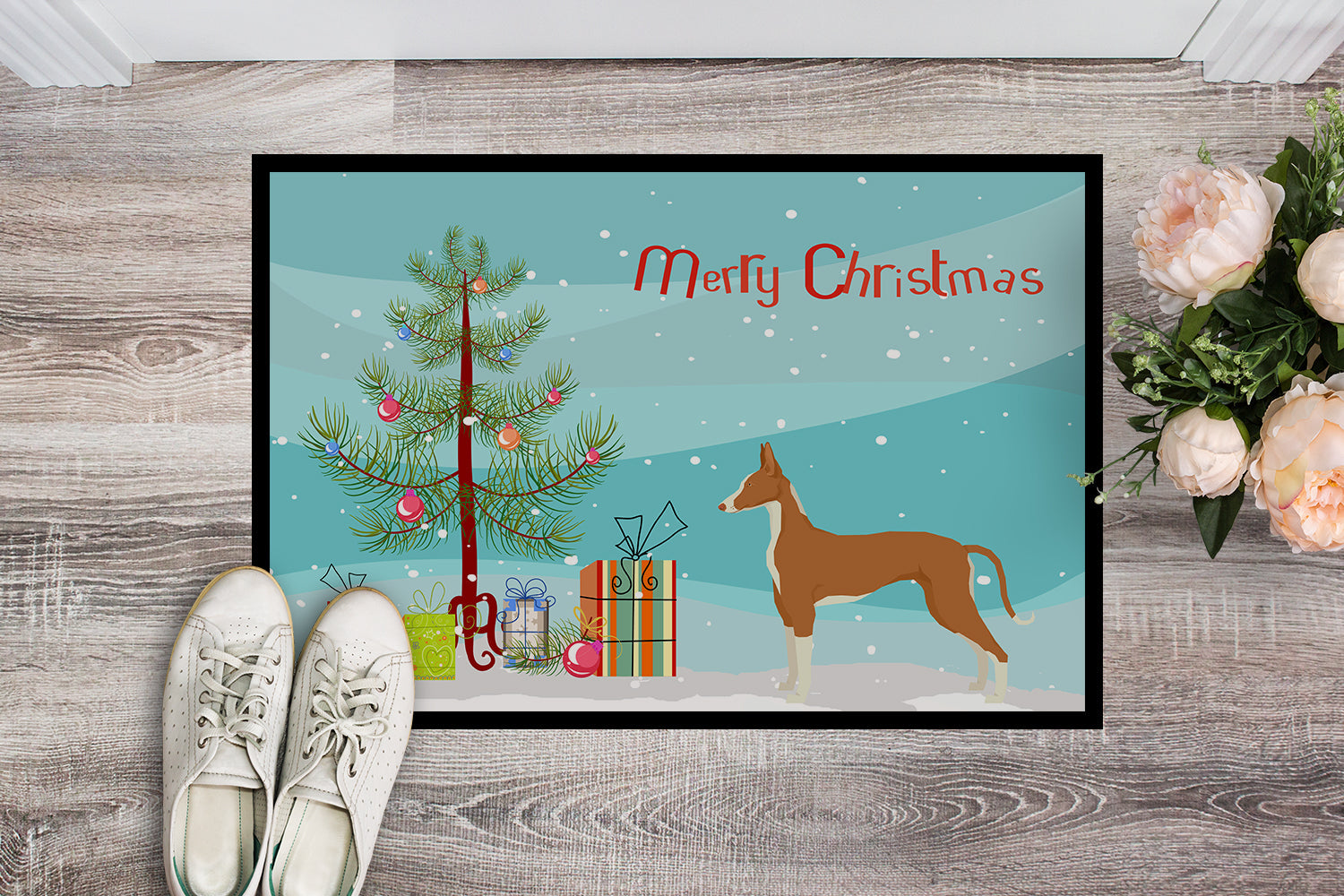 Decorate your space with our Christmas Ibizan Hound artwork on a Doormat. Welcome your guests in style with our Artwork Door Mat, designed to withstand almost any weather condition. This mat, measuring approximately 18 by 27 inches, is held together by durable black binding tape. Its top layer, composed of polyester felt, is dyed with the eye-catching image you see on the mat. A few layers below provide the mat with stability, while its rubber bottom is stamped to help prevent slipping and ensures safety. Our mat works wonderfully as both an indoor or outdoor door mat. For cleaning, simply hose it off with water or use a power washer - no need for any cleaner that produces suds. Avoid scrubbing with a brush, instead, opt for the vacuum on floor setting. Designed manufactured and printed in the USA, this mat is a perfect addition to your porch, outdoor kitchen, entryway, or any indoor space. Its unique design makes it a charming decorative rug that greets your guests and adds a stylish touch to your home decor.