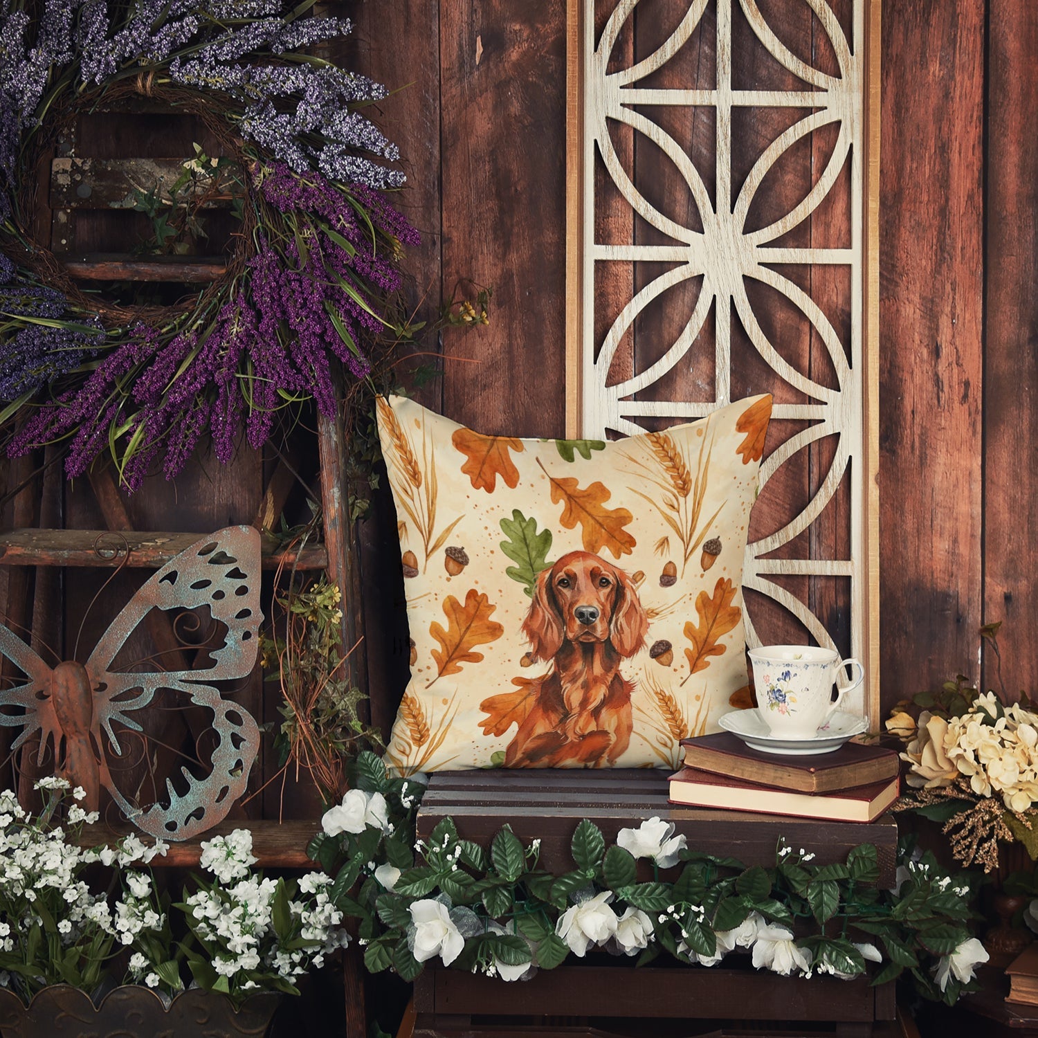 Throw Pillow featuring breed specific Irish Setter artwork. Celebrate Thanksgiving with this Thanksgiving Pillow. Revitalize your outdoor or indoor living space with Caroline's Treasures 18x18 Fabric Decorative Pillow. With a generously sized dimension of approximately 18 inches by 18 inches, this pillow makes a comfortable and aesthetic addition to any seating area. Made from a unique, water-resistant material developed by Caroline's Treasures, the pillow sham is 100% polyester fabric that's durable and ready to weather any condition. Its vibrant, full-color artwork will not fade over time as it is dyed with color-fast dyes. Whether you place it on your patio furniture, porch, veranda, or indoor couch, its soft canvas fabric ensures a cozy experience. The pillow is handcrafted in the United States, featuring a sham created from three pieces of fabric and a polyester insert for enduring shape and overstuffed comfort. Despite being robustly built to endure the outdoors, it is as soft and snug as your favorite indoor cushions. Please note, as all our pillows are handmade, sizes may vary slightly, adding to the charm of this unique decorative item.