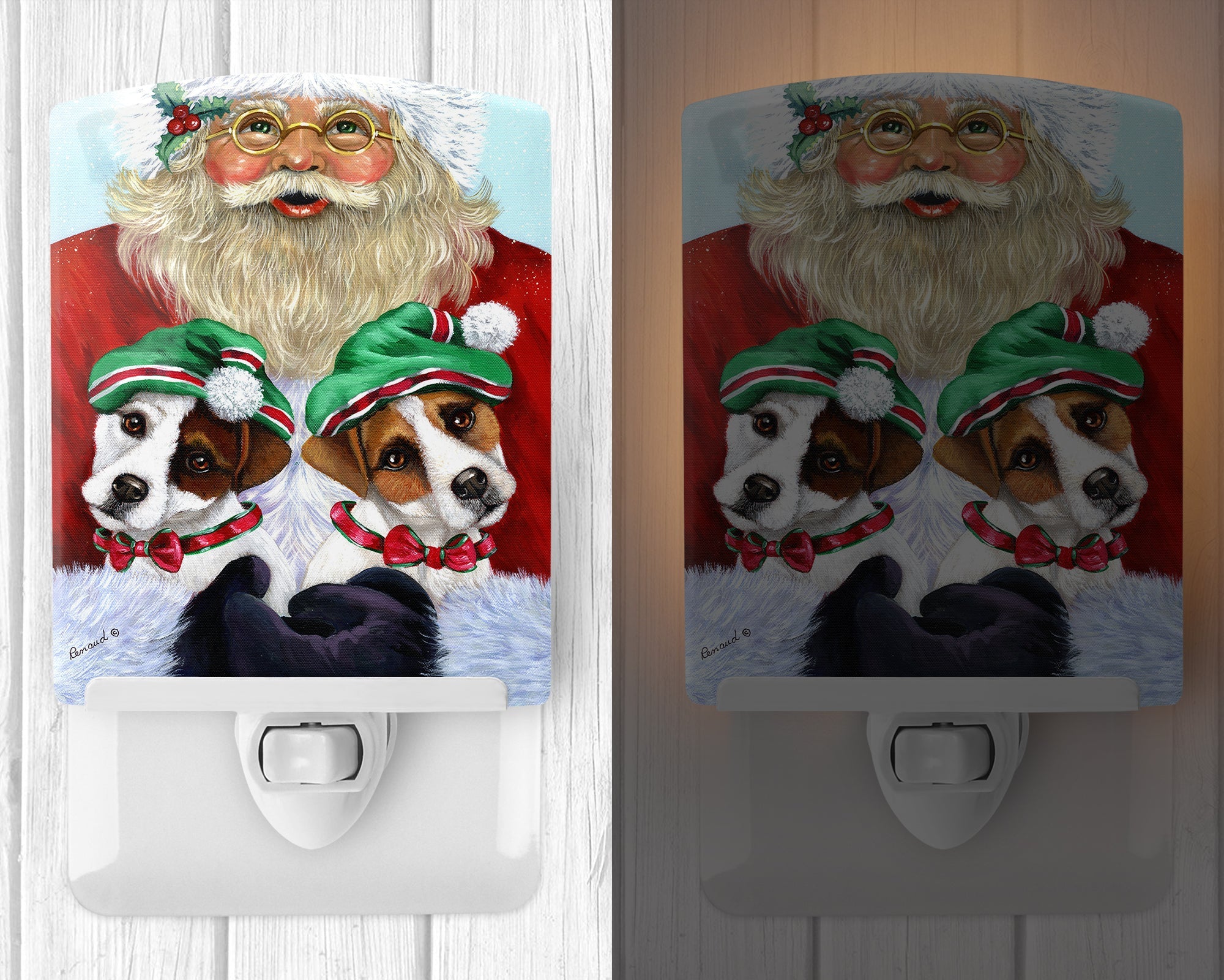 Decorate your space with our Christmas Jack Russell Terrier artwork on a Night Light. Introduce a splash of artistic flair and subtle illumination to your space with the Decorative Ceramic Night Light from Caroline's Treasures. Perfect for any room, this night light seamlessly blends functionality with an aesthetic appeal, offering a stylish solution to brighten up dark corners of your home or office. Boasting a six-inch high by four-inch wide ceramic tile at the front, it showcases vivid, full-color artwork from distinguished artists, transforming a simple utility into a vibrant art piece. The artwork is securely encased in a robust metal holder, ensuring durability and longevity. Two screws are provided to firmly affix the tile into the holder. The holder extends three inches deep, housing an included bulb that emits a soft, welcoming glow. This product meets all safety standards, as evidenced by its UL approval. Proudly made in the United States from imported components, this Decorative Ceramic Night Light is not just a functional device; it's a statement piece that enhances the ambiance of your surroundings.