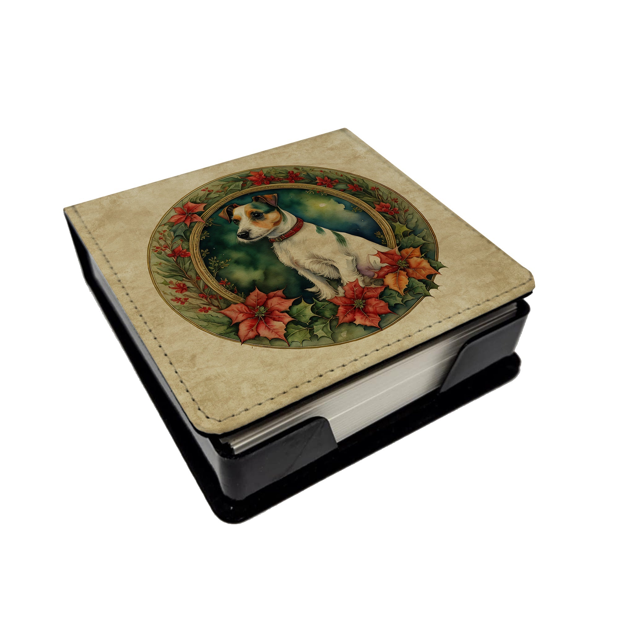 PU Leather Note Paper Holder featuring breed specific Jack Russell Terrier artwork. Celebrate Christmas with this Christmas Note Paper Holder. Elevate your workspace with this PU Leather Note Paper Holder, crafted to resemble luxurious leather without the use of animal products. Made from durable synthetic PU leather, it offers both a premium look and eco-friendly appeal. This note holder, compactly sized at 4.25 x 4.25 x 1.25 inches, includes about 160 sheets of 3.75 x 3.75-inch note paper—ideal for quick notes and reminders. An exclusive artist-designed cover makes each holder uniquely vibrant, adding a splash of color and personality to any desk or office. The discrete design keeps note paper hidden, maintaining a neat and organized workspace. Perfect as a gift or for personal use, this stylish holder is refillable with standard paper, ensuring long-lasting utility. A must-have for anyone seeking a sophisticated, artful touch to their workspace while supporting animal-friendly products. Add style, organization, and creativity to your everyday routine with this elegant note paper holder.