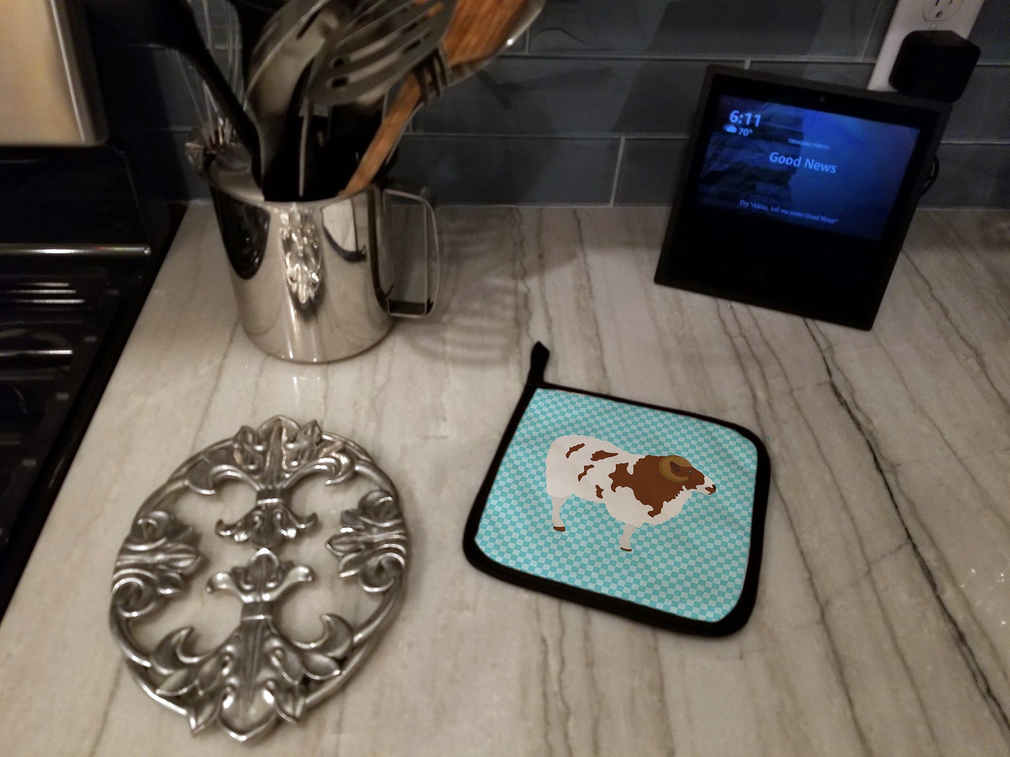 Decorate your space with our Jacob Sheep artwork on a Pair of Pot Holders. A Pair of Pot Holders to match your kitchen decor. Made in the USA these are thick and functional. Full color artwork decorates the front polyester fabric of the hot pad and accented by a black trim. Use these at as a trivet for your Thanksgiving or Christmas tablescape. Filled with insulated fabric and quilted for durability. These colorful pot holders will make a great gift for your favorite home cook or executive chef. Each pot holder measures approximately 7 1/2 inches by 7 1/2 inches. A hanging tab is included.