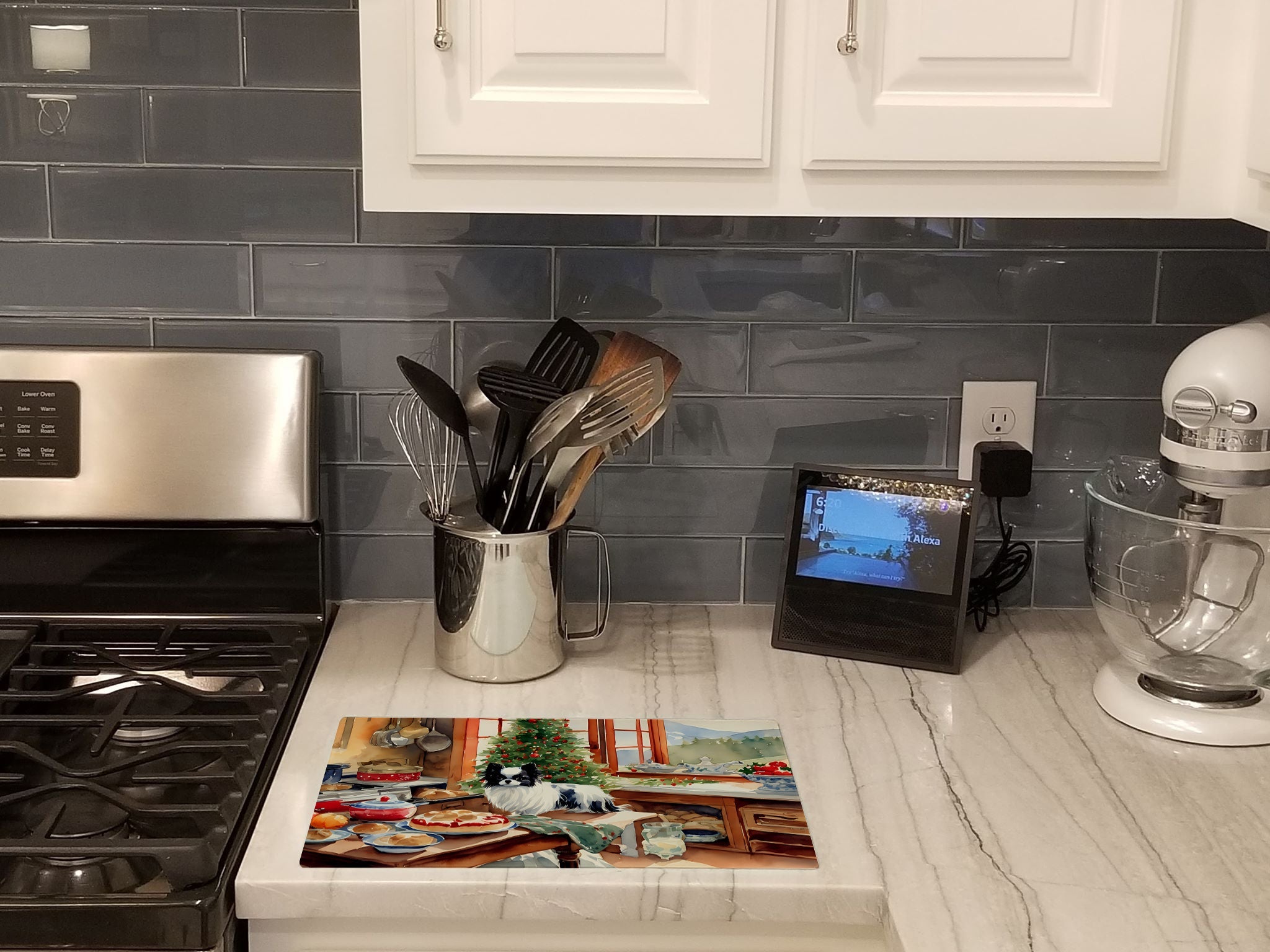 Decorate your space with our Christmas Japanese Chin artwork on a Cutting Board. Introduce your kitchen to the vibrant, large Decorative Glass Cutting Board from Caroline's Treasures. Crafted from resilient tempered glass, this board is not only a utilitarian necessity but also a colorful art piece. With its generous dimensions of 15 inches in height and 12 inches in length, it offers ample space for all your cutting needs. Every piece showcases captivating artwork from distinguished artists, bringing an aesthetic edge to your kitchen. Beyond its attractive design, this cutting board ensures your countertop stays pristine and unscathed, owing to its heat-resistant properties. Engineered with user convenience in mind, it features non-skid feet for stability, and rounded corners for additional safety. Its robust construction renders it virtually unbreakable, guaranteeing longevity. The board comes with protective feet bumpers, maintaining its position during use. This product is recommended to be hand washed only. Proudly printed and assembled in the United States, this cutting board exemplifies superior craftsmanship. With Caroline's Treasures' Decorative Glass Cutting Board, you're investing in a blend of functionality and artistic flair.