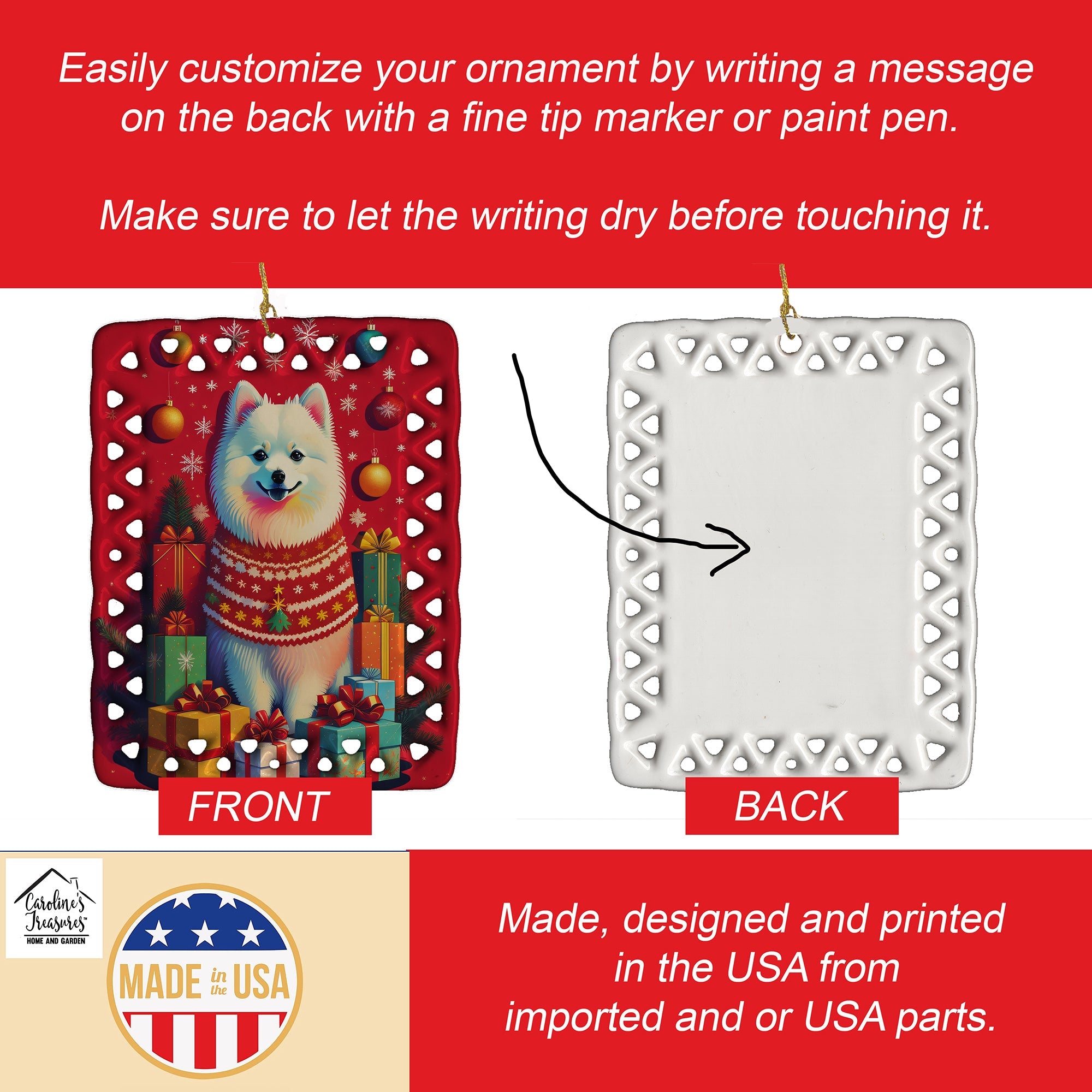 Porcelain Ornament featuring breed specific Japanese Spitz artwork. Celebrate Christmas with this Christmas Ornament. Add a unique, personal touch to your holiday decor with our Rectangular Lattice Porcelain Ornament. Perfect for creating cherished memories, this high-quality ornament shines under festive lights, reflecting warmth and joy throughout your Christmas tree. Crafted with a glossy finish, it showcases vibrant, full-color artwork contributed by our talented artists, ensuring your tree is adorned with a burst of color and holiday spirit. What sets this Porcelain Ornament apart is its customizable white back. Use a paint pen or permanent marker to write a heartfelt message, commemorate a special year, or mark an unforgettable date, turning this ornament into a keepsake that will be treasured for years to come. For best results, allow any personalization to dry thoroughly before handling. Each ornament comes complete with a delicate gold cord, making it easy to hang and display. Proudly made in the USA, this ornament measures 3.375 x 2.625 inches and is a thoughtful gift for pet sitters, teachers, family members, or anyone who would appreciate a little extra holiday magic. Bring style, charm, and a touch of personal meaning to your Christmas tree with this beautifully designed ornament..