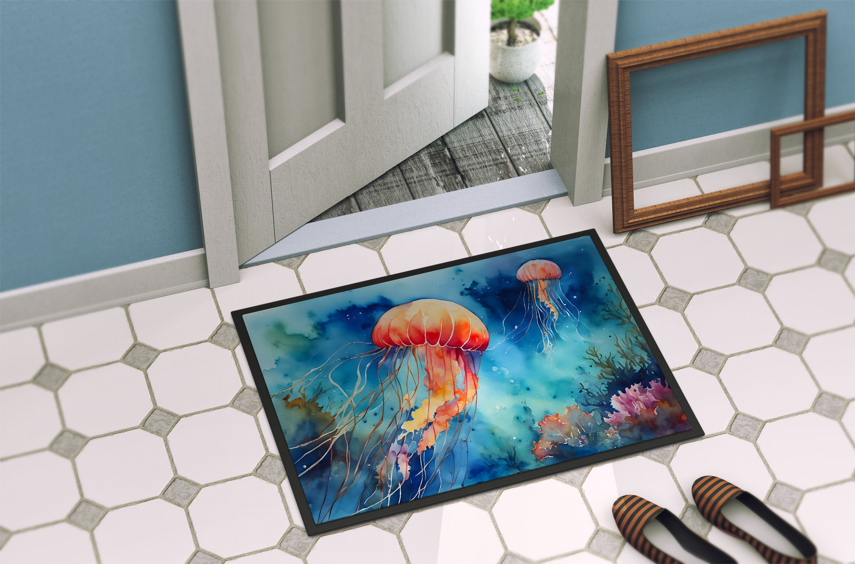 Decorate your space with our Jellyfish artwork on a Doormat. Welcome your guests in style with our Artwork Door Mat, designed to withstand almost any weather condition. This mat, measuring approximately 18 by 27 inches, is held together by durable black binding tape. Its top layer, composed of polyester felt, is dyed with the eye-catching image you see on the mat. A few layers below provide the mat with stability, while its rubber bottom is stamped to help prevent slipping and ensures safety. Our mat works wonderfully as both an indoor or outdoor door mat. For cleaning, simply hose it off with water or use a power washer - no need for any cleaner that produces suds. Avoid scrubbing with a brush, instead, opt for the vacuum on floor setting. Designed manufactured and printed in the USA, this mat is a perfect addition to your porch, outdoor kitchen, entryway, or any indoor space. Its unique design makes it a charming decorative rug that greets your guests and adds a stylish touch to your home decor.