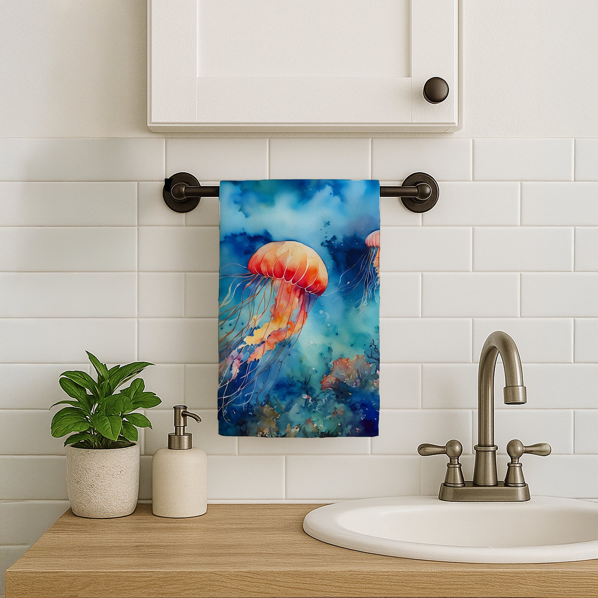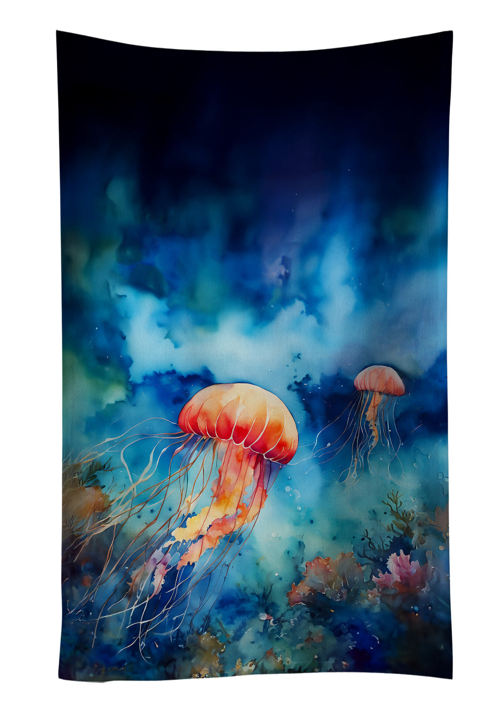 Shown here is the Jellyfish Kitchen Towel from Caroline's Treasures featuring artwork of a Jellyfish in a Everyday design. The detailed illustration and vibrant colors make it a standout accent that celebrates both seasonal style and love for the subject. Set sail into seaside style with our Nautical Collection. Featuring coastal-inspired designs anchored in classic ocean motifs and breezy charm, this collection brings relaxed personality and timeless décor to your home and thoughtful gifts for lovers of coastal living. Everyday décor celebrates personal style and the small moments that make a house feel like home. Thoughtful designs add warmth and personality that can be enjoyed year-round. Bring cozy everyday charm to your sink or powder room with a plush velour towel featuring original watercolor artwork. The front is a soft, color-rich minky polyester that polishes glassware to a brilliant shine; the back is 100% white cotton terry loop for quick absorbency on hands, dishes, and counters. Artwork is dyed into the fibers for lasting color that won’t crack or peel. Finished edges keep the shape wash after wash. Size: 15" x 25". Machine wash; tumble dry low. Designed and printed in the USA. Perfect for: Kitchen counters, ovens, and towel bars, everyday drying and cleanup, Fish-themed kitchens, or year-round use for Jellyfish lovers. Jellyfish display translucent bodies with flowing tentacles. Their movement feels fluid and serene. Makes a heartfelt gift for: Jellyfish owners, Fish lovers, Everyday gifts, pet parents, friends who adore their Jellyfish, or anyone celebrating Fish.