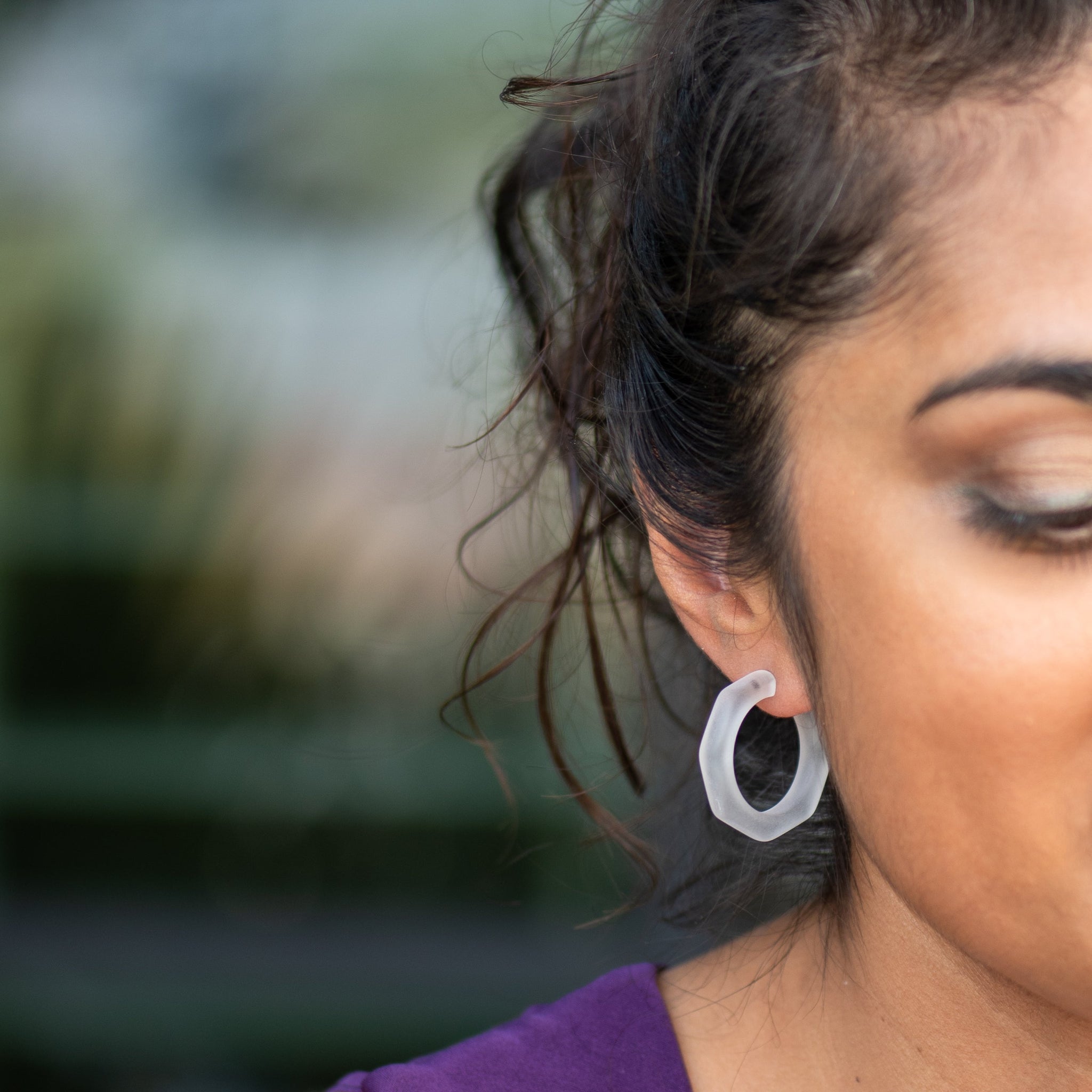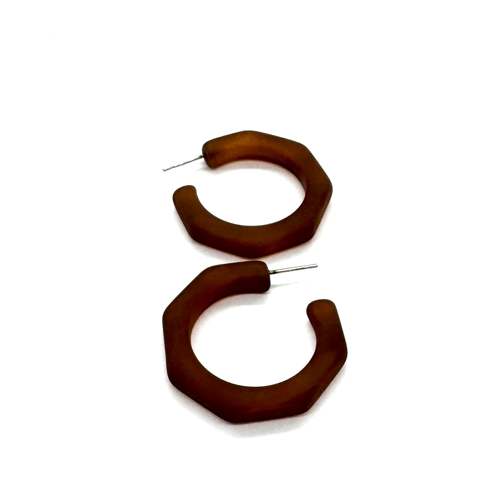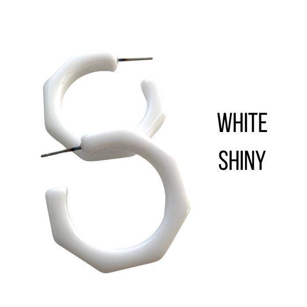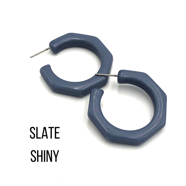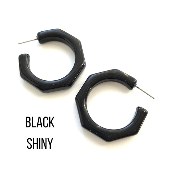 Beveled octagon-shaped hoop earrings in either a frosted or shiny finish, known as the Kay Hoops and made with vintage lucite. Each is 1.25 inches or 30mm in diameter and 6mm thick. Super retro, geometric shape, these are a light-weight earring set by hand with surgical steel. We unearthed these vintage plastics in Europe & finish them off in our AZ studio.