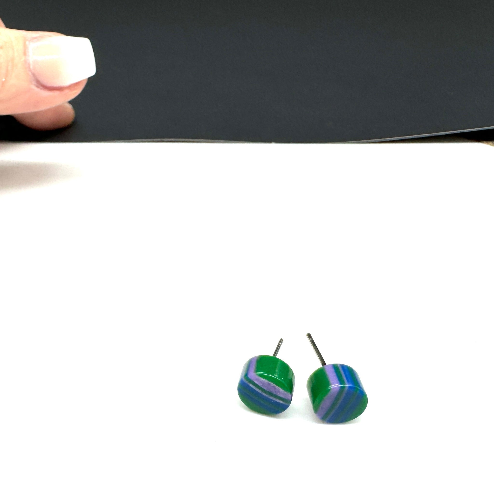 Darling size post earrings in emerald green, deep blue & purple striped plastics. This is the pair of earrings that goes with every outfit. Each measures 8mm in diameter. See the last pic for the scale of how they look when worn (the squares in that pic are about the same size). And the 2nd pic shows the matching necklace that is available.