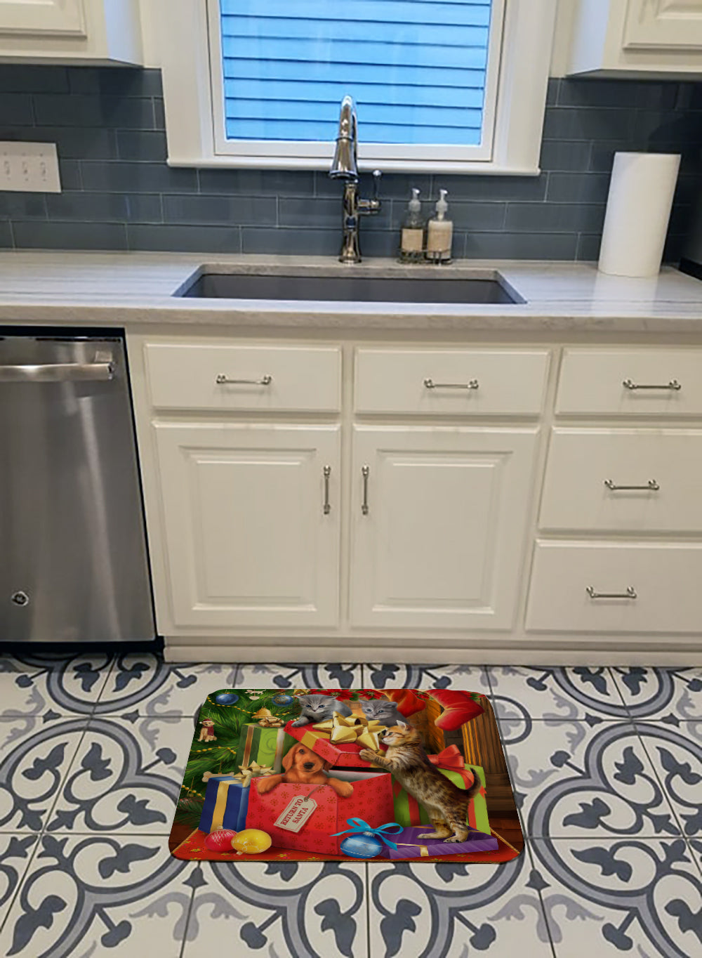 Kittens Return Puppy to Santa Claus Machine Washable Memory Foam Mat PTW2010RUG