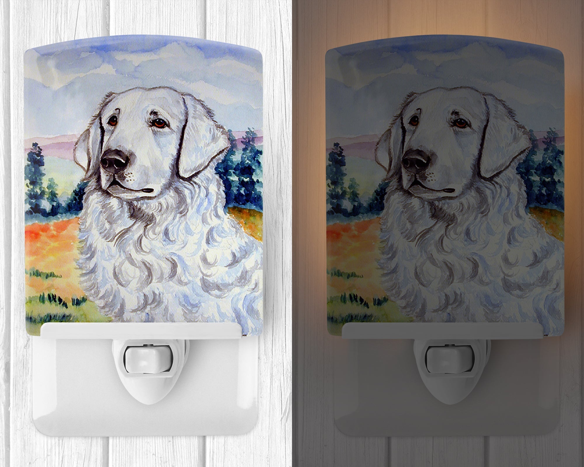 Decorate your space with our Kuvasz artwork on a Night Light. Introduce a splash of artistic flair and subtle illumination to your space with the Decorative Ceramic Night Light from Caroline's Treasures. Perfect for any room, this night light seamlessly blends functionality with an aesthetic appeal, offering a stylish solution to brighten up dark corners of your home or office. Boasting a six-inch high by four-inch wide ceramic tile at the front, it showcases vivid, full-color artwork from distinguished artists, transforming a simple utility into a vibrant art piece. The artwork is securely encased in a robust metal holder, ensuring durability and longevity. Two screws are provided to firmly affix the tile into the holder. The holder extends three inches deep, housing an included bulb that emits a soft, welcoming glow. This product meets all safety standards, as evidenced by its UL approval. Proudly made in the United States from imported components, this Decorative Ceramic Night Light is not just a functional device; it's a statement piece that enhances the ambiance of your surroundings.