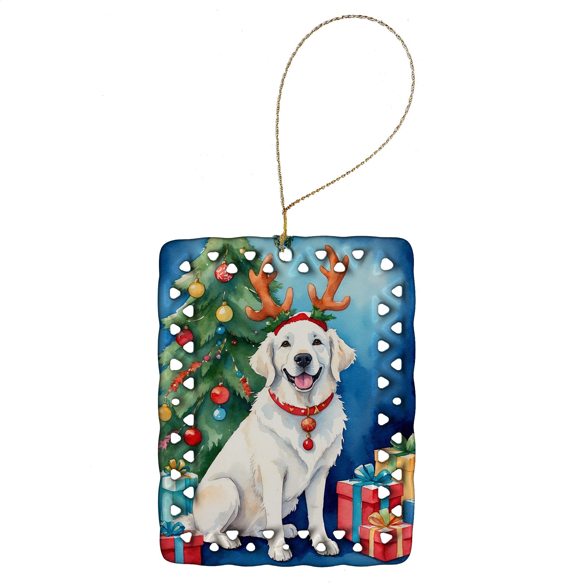 Porcelain Ornament featuring breed specific Kuvasz artwork. Celebrate Christmas with this Christmas Ornament. Add a unique, personal touch to your holiday decor with our Rectangular Lattice Porcelain Ornament. Perfect for creating cherished memories, this high-quality ornament shines under festive lights, reflecting warmth and joy throughout your Christmas tree. Crafted with a glossy finish, it showcases vibrant, full-color artwork contributed by our talented artists, ensuring your tree is adorned with a burst of color and holiday spirit. What sets this Porcelain Ornament apart is its customizable white back. Use a paint pen or permanent marker to write a heartfelt message, commemorate a special year, or mark an unforgettable date, turning this ornament into a keepsake that will be treasured for years to come. For best results, allow any personalization to dry thoroughly before handling. Each ornament comes complete with a delicate gold cord, making it easy to hang and display. Proudly made in the USA, this ornament measures 3.375 x 2.625 inches and is a thoughtful gift for pet sitters, teachers, family members, or anyone who would appreciate a little extra holiday magic. Bring style, charm, and a touch of personal meaning to your Christmas tree with this beautifully designed ornament..